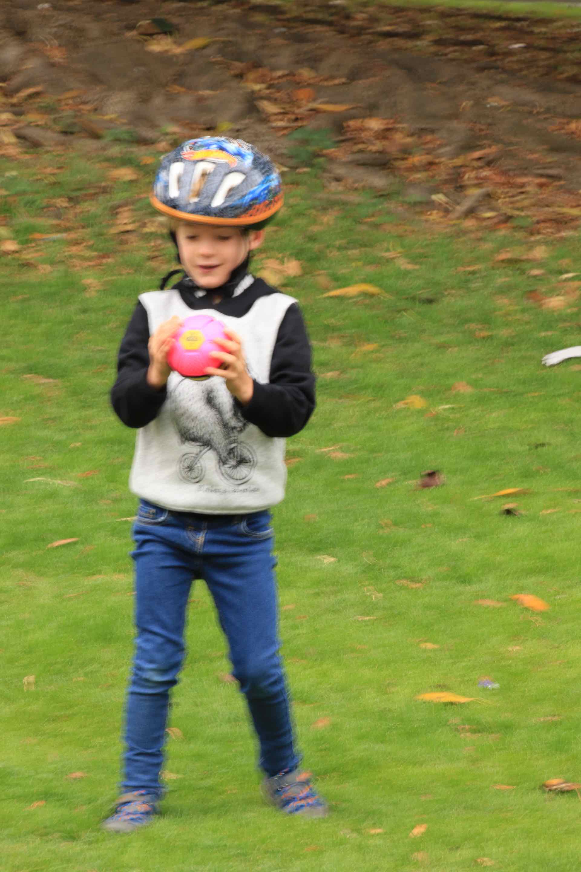 Top: Oscar’s new toy; Lyn and throwing practice. Bottom: Lyn borrows Oscar’s new bike; Oscar gets muddy; Lyn Still on Oscars bike!