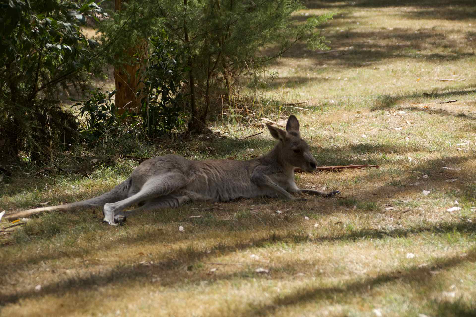 We started our day out in Woodend a village in the Macedon Ranges close to our ultimate destination of Hanging Rock. It is a charming village, friendly and quiet. Hanging Rock however was not. We arrived in time for our picnic lunch and found a table in the shade away from the crowds of young school children playing on the sports field nearby. As we sat, I spotted a small kangaroo in the undergrowth a short distance away. He slowly made his way along the line of a gully whilst looking for a place to cross. A little further along he found a shallow bank and tentatively came down the bank and slowly up on to our side. We watched enraptured and very quiet as he moved slowly along, occasionally stopping to eat and chew what grass he could get. This was very unusual as Kangaroos are normally timid creatures and pack animals. This poor thing was alone. He ended up about six feet from our picnic bench and lay down for a sleep. After watching him for a while we quietly picked up our things and left him dosing.