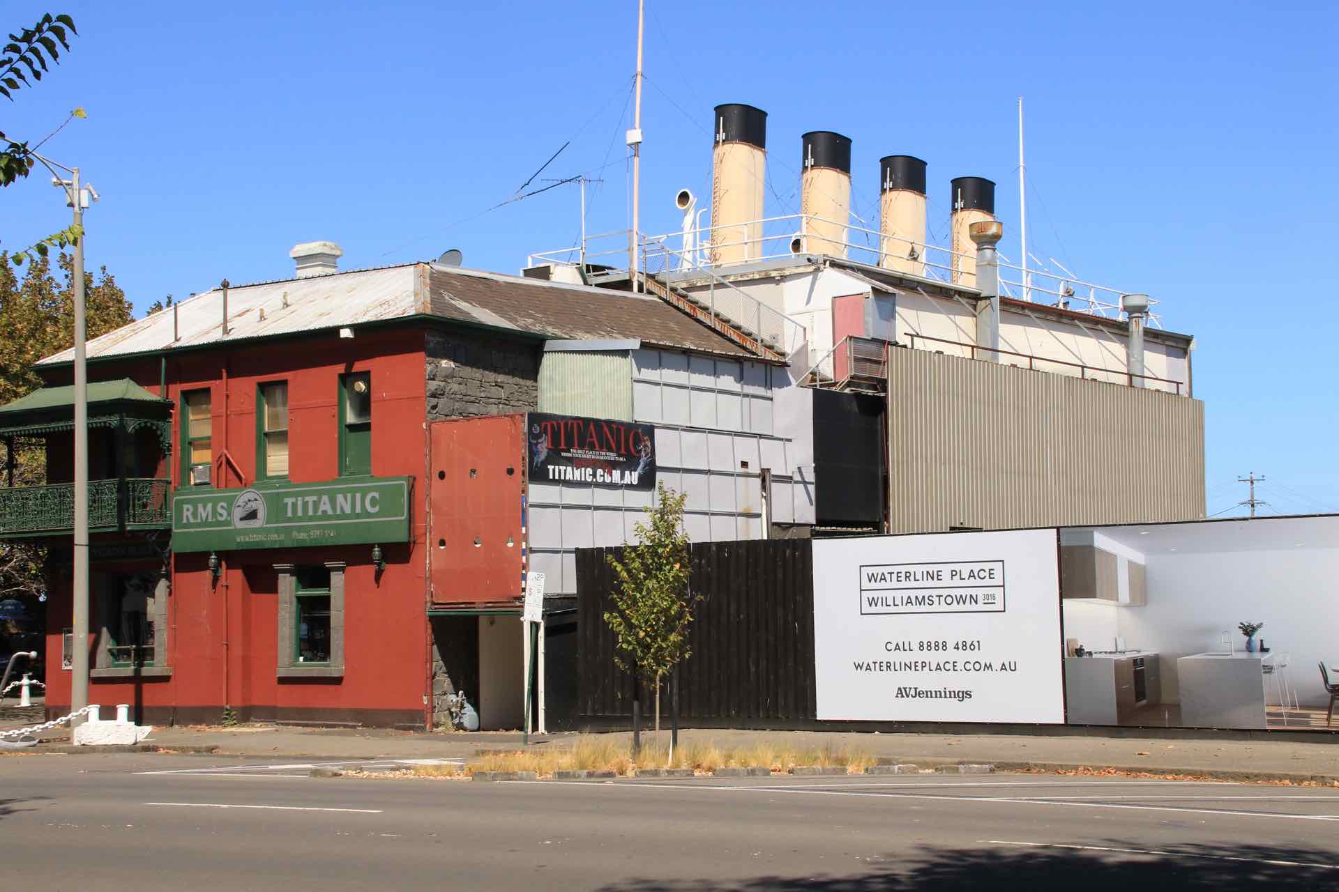 Parts of Williamstown are worth exploring and there is a a walk from Nelson Place which covers many of the historic buildings built out of the gold rush and subsequent prosperity. Walk past the modern BAE Systems Factory and on to a wide, extensive esplanande with many original trees still in place. One quirky building on this route is a theatre restaurant, themed as RMS Titanic and named after the ill-fated liner. From the shape and the funnels on the roof everything is Titanic related and guests are asked to suspend reality when they enter and are encouraged to imagine they are travelling first class and dress accordingly if so desired. Apparently the nightly comedy show is a hit with customers, if a little ragged in production. We were there for early afternoon, so no show or dinner for us, for which I am mighty relieved!