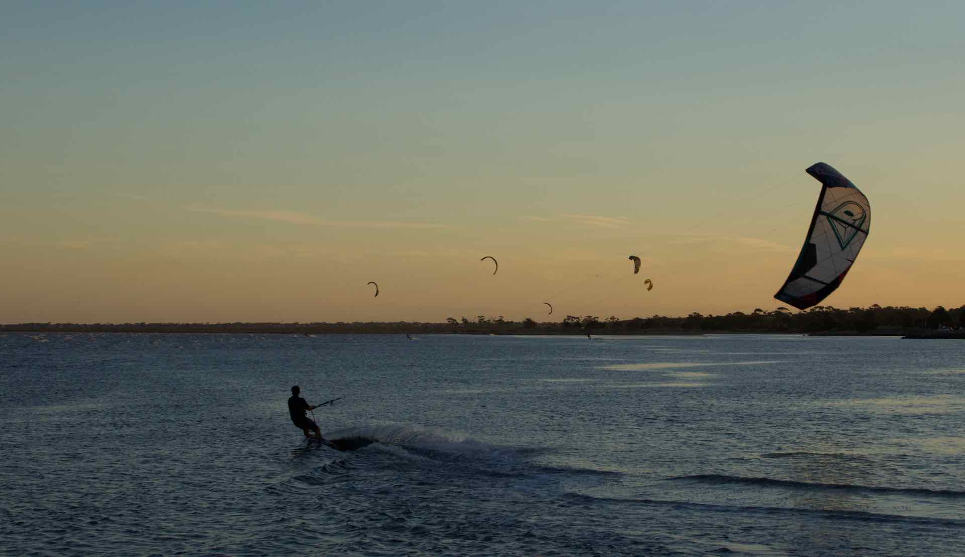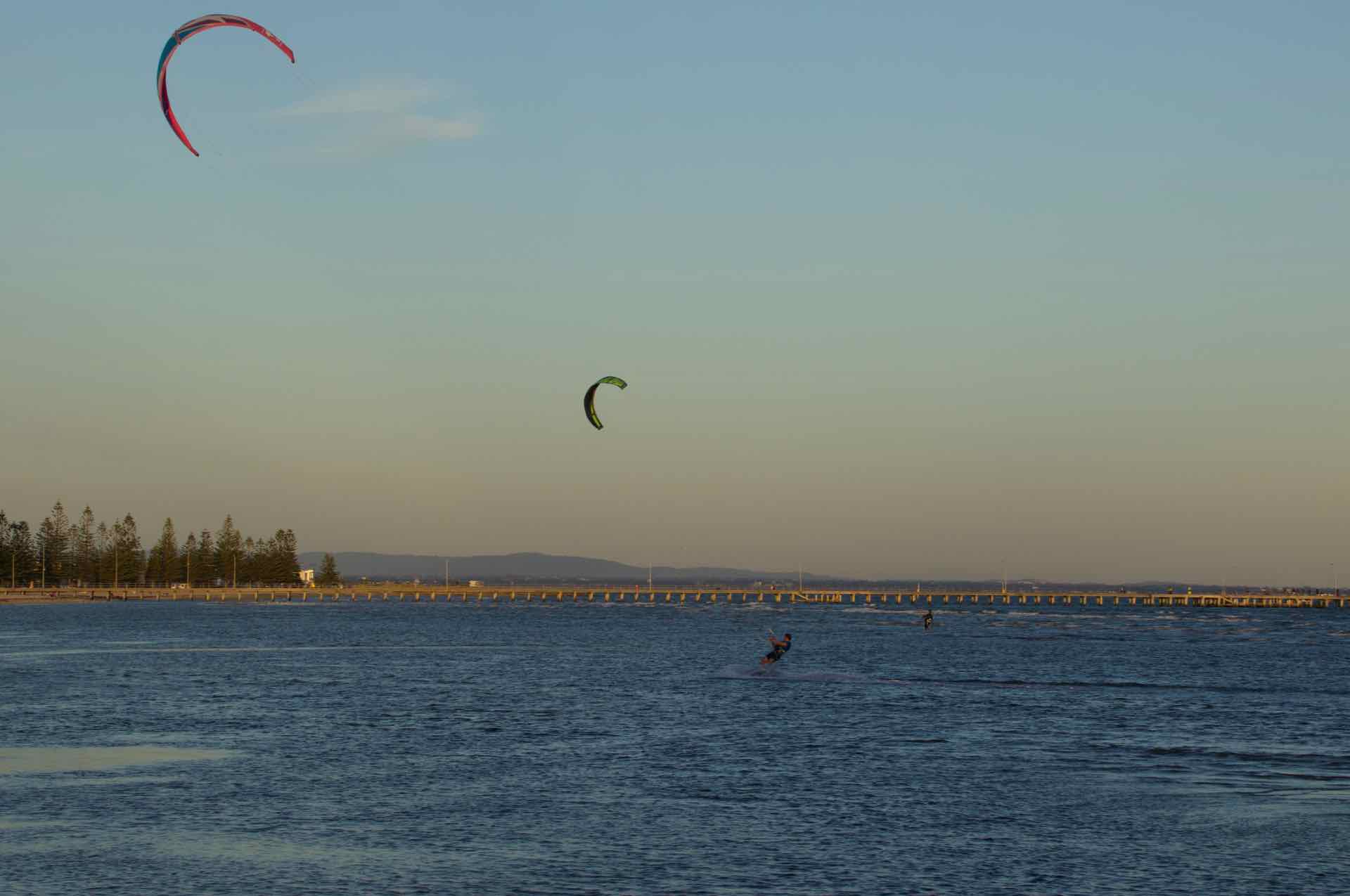 The wide open spaces and calm seas just offshore are ideal for Kite surfers and with the regular stiff breezes they are a common sight. The pictures below were taken on a weekday evening just before sunset when about twenty kite surfers were racing across the bay. It was a beautiful sight with the large kite “wings” filled out by the stiff breeze skimming the rider on the board rapidly across the water. Majestic.