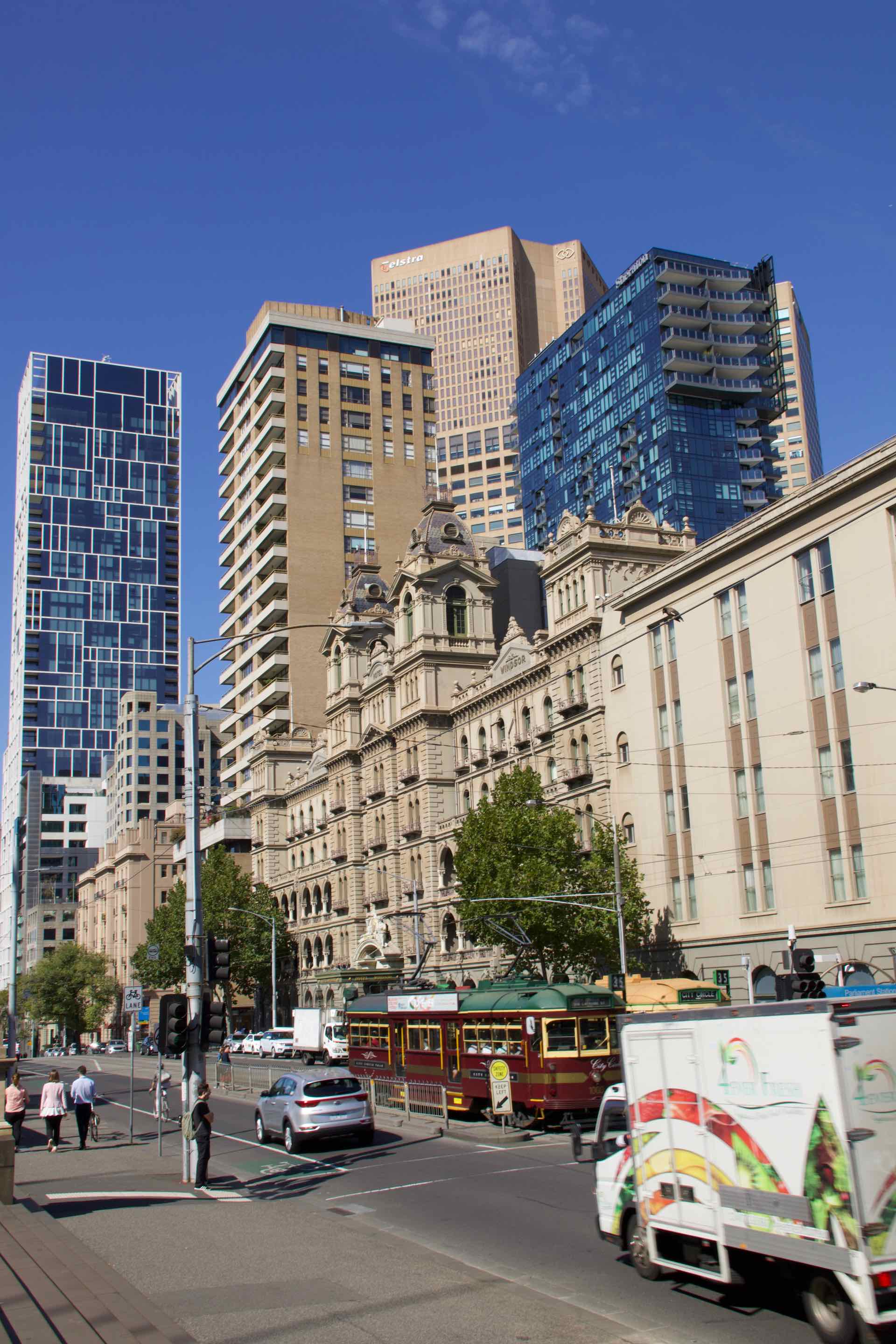 The old and the New: Top Left: Old – Palace Theatre; New – CBD. Bottom Left: New office space encroaches on old buildings; Old and Famous: Flinders St Station – The Clocks