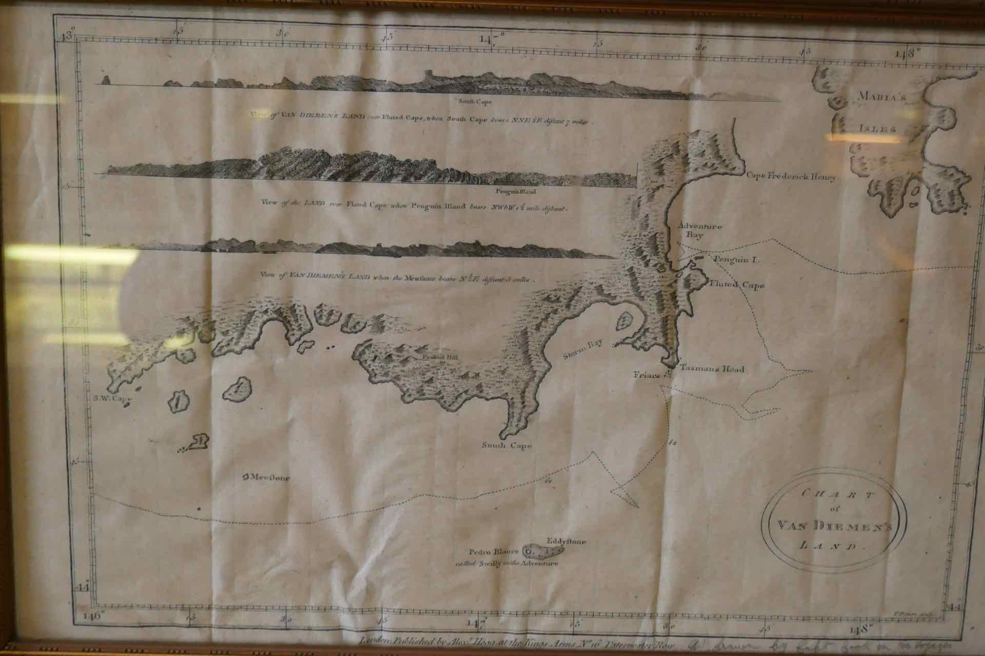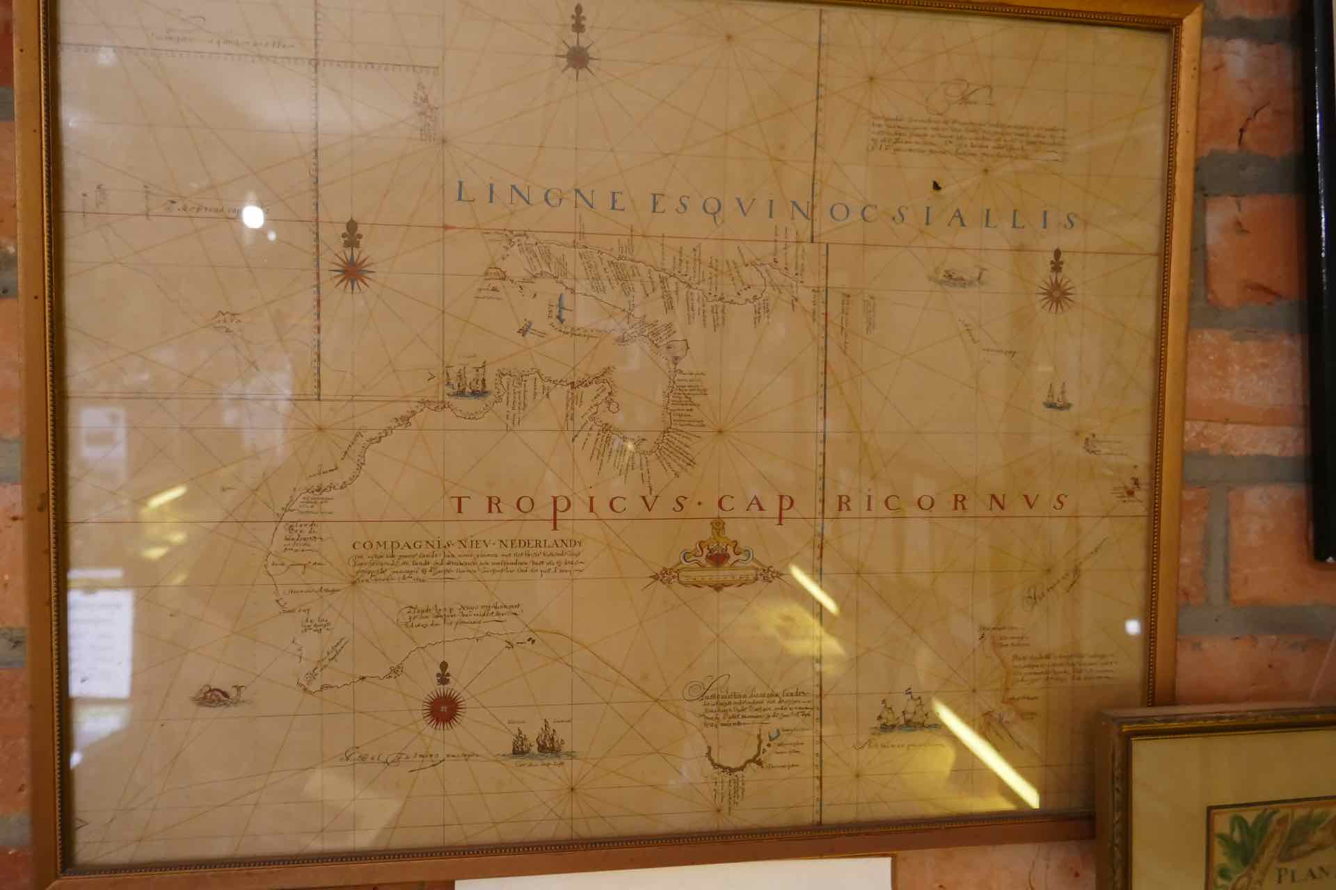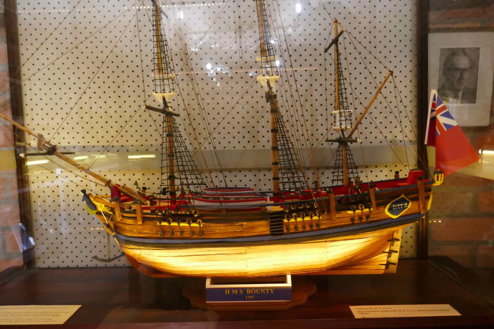 Exhibits from the Bligh Museum: Clockwise from top left: List of Cook’s voyages; Map of the south part of Van Diemen’s Land; Model of HMS Bounty; Framed map of the south part of Van Diemens Land made by Cook.