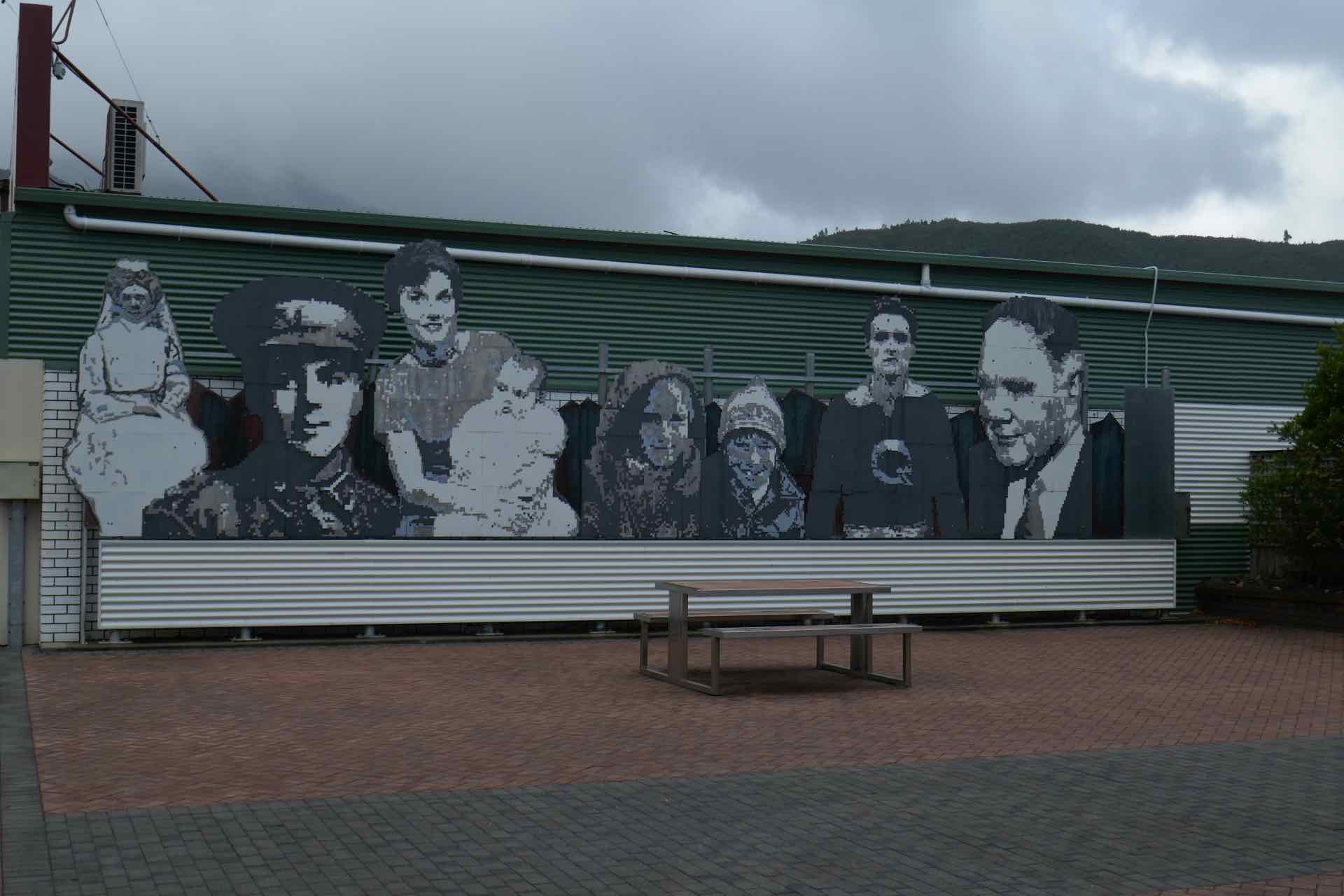 Clockwise from top left: Mural as you enter Queenstown; Our coffee stop; Empire Hotel Queenstown; General store; Main Street Queenstown.
