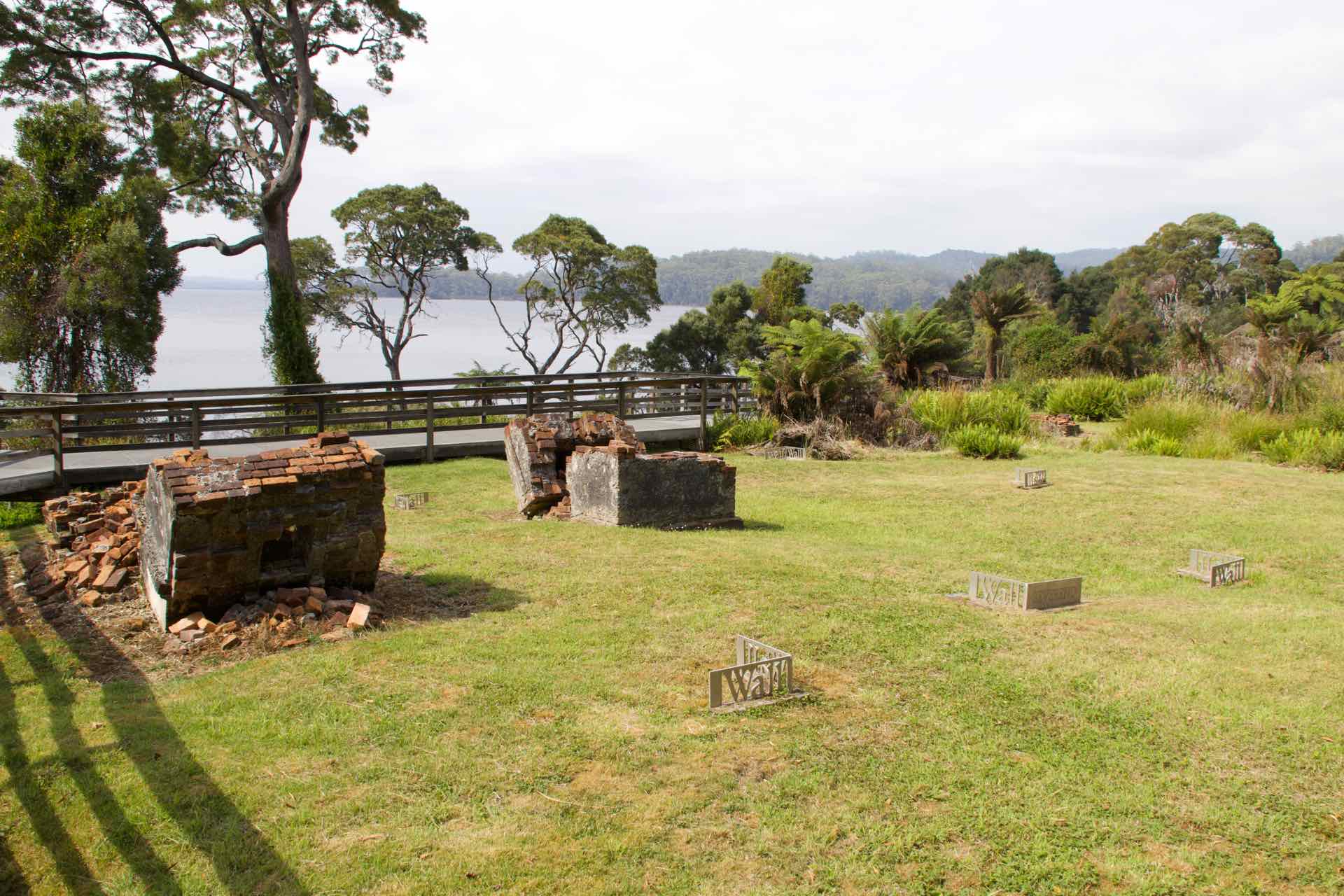 Clockwise from top left: Part of the old bakery ovens; Lyn on Sarah Island; Escape is impossible – the Wilderness Mountains from Sarah Island.