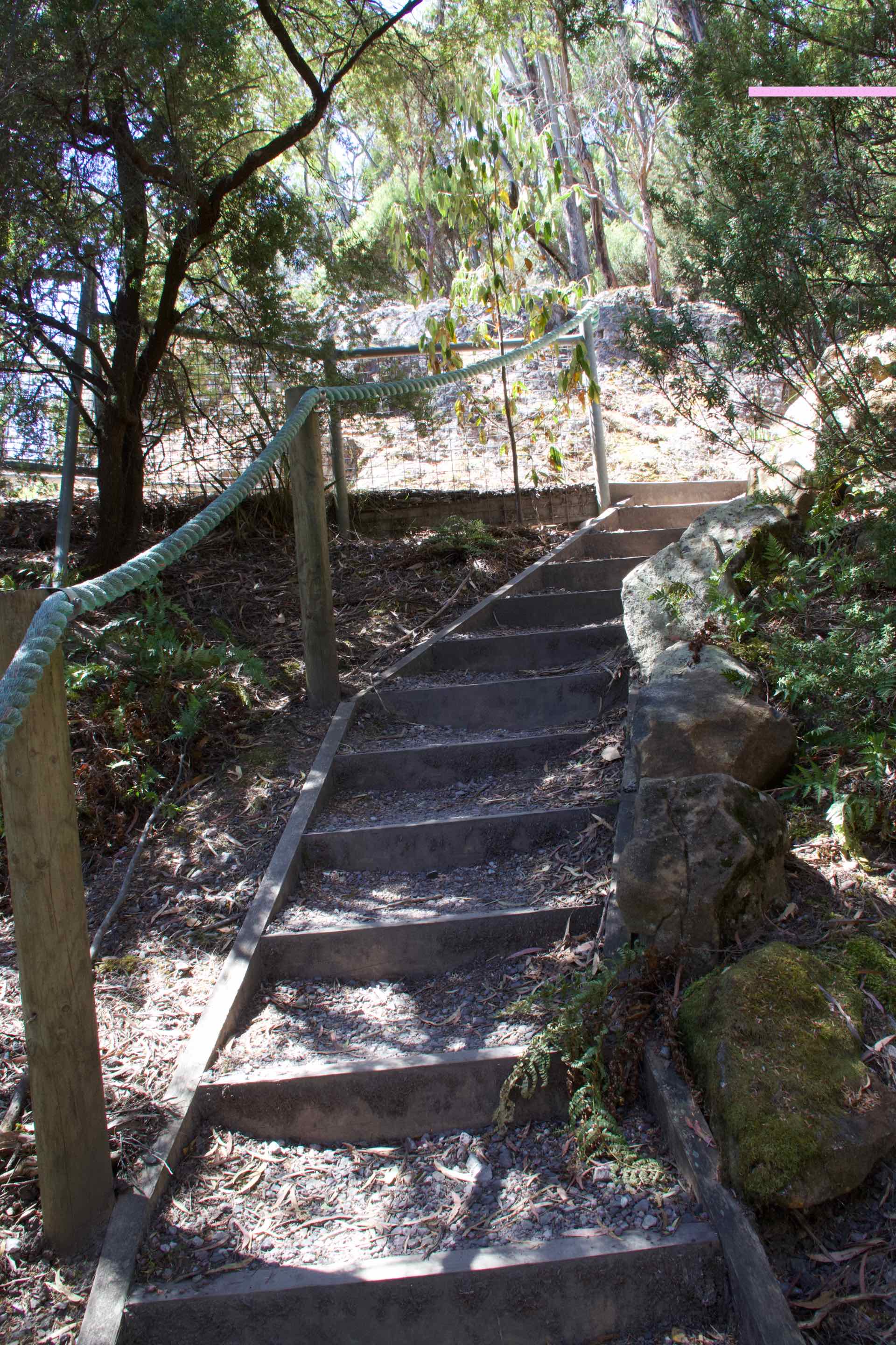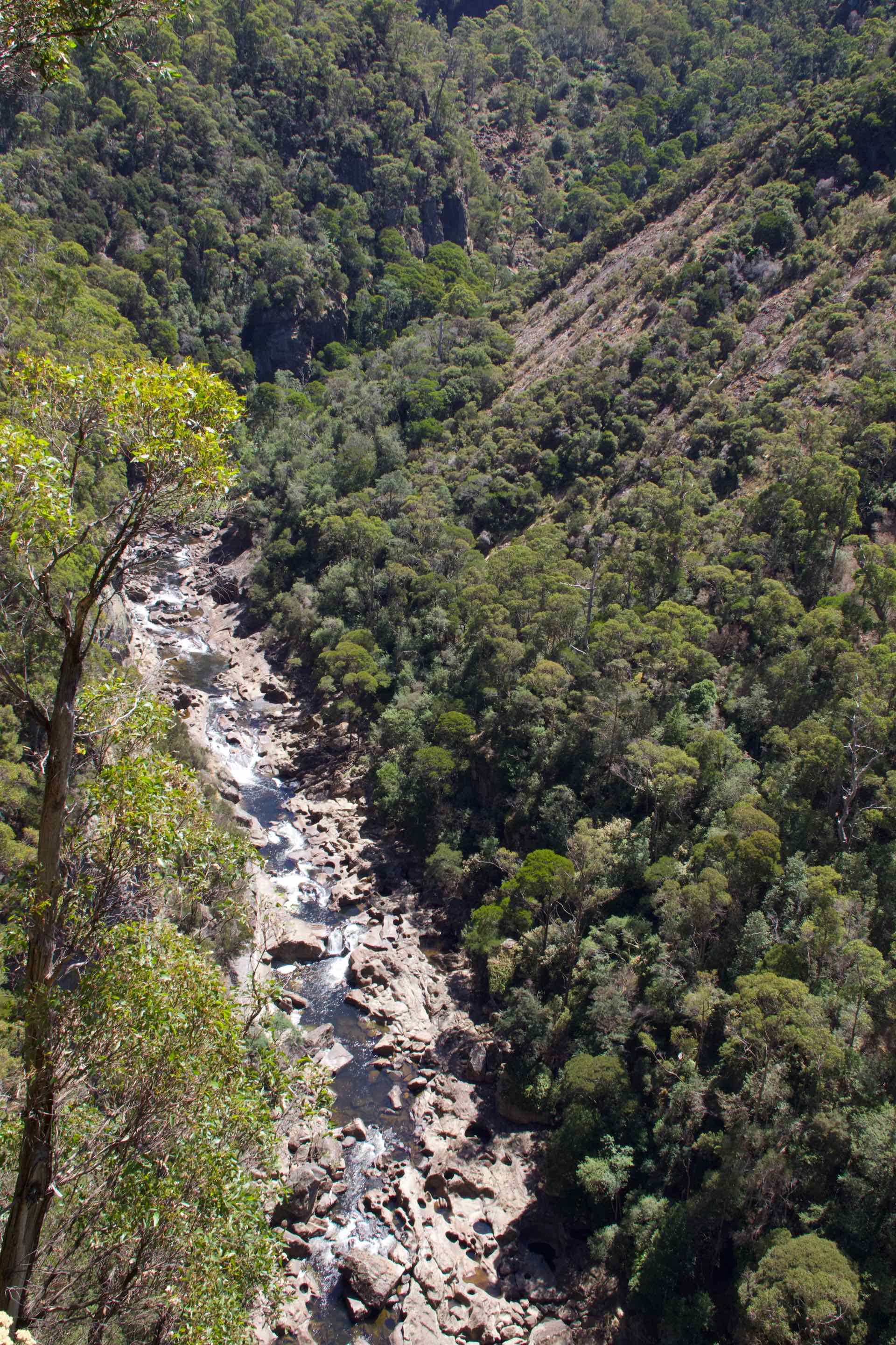 Our ultimate destination for the day was the Leven Canyon. A short drive from the gardens, it had two walks from where we were parked, clockwise and anti-clockwise, both through the forest to look out platforms perched out over the canyon. We elected to go clockwise so we set off down a very steep path through the forest. About 30 mins later we arrived at the steel platform erected out over the canyon. Both sides were almost vertical yet were completely forested. The river flowing through at the bottom was very low but despite that the views were excellent. We lingered there a while watching and photographing before retracing our steps for a short while before starting the climb up to the second lookout a little further up the canyon. 15 minutes and 697 steps later we reached the second lookout which was even further out into the canyon! After that climb, the walk back to the car was easy!