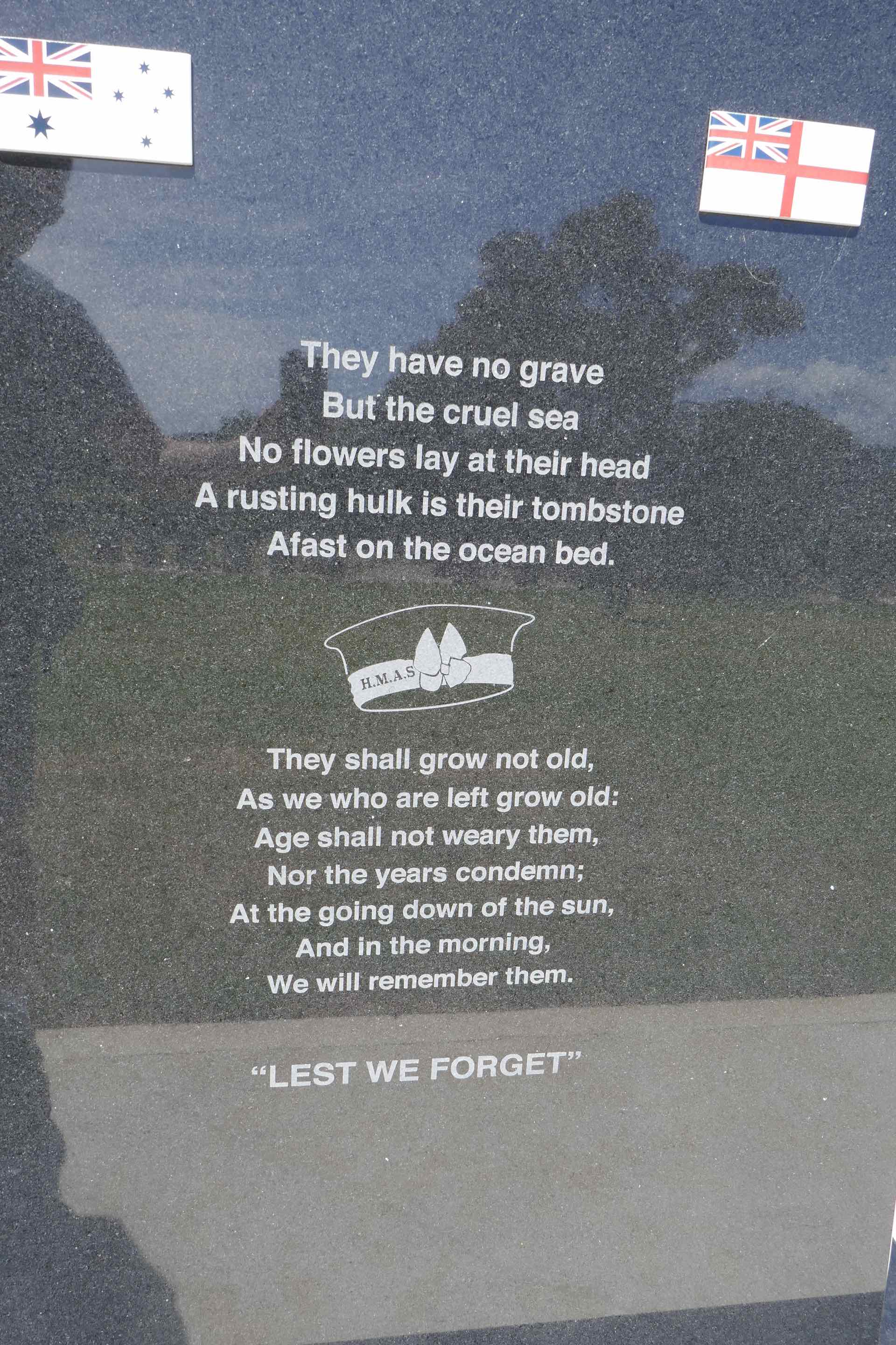Close to the centre of Ulverstone is a large park, immaculately kept. Part of it is known as Shropshire Park and is Australia’s largest Naval Memorial Park. It was initially built to remember the men of HMAS Shropshire, a WW2 cruiser given to the RAN by the British in 1942 to replace HMAS Canberra, which was destroyed in action. The park now stands as a memorial to over 100 Australian naval ships as well as to those who served. The path that takes you round the park leads to a very tranquil beach with a long breakwater. As always, Lyn needs to know what is at the end (easy — water and the Bass Strait!) so she walked the length whilst I sat on the beach and watched sea birds strut around and generally annoy each other.