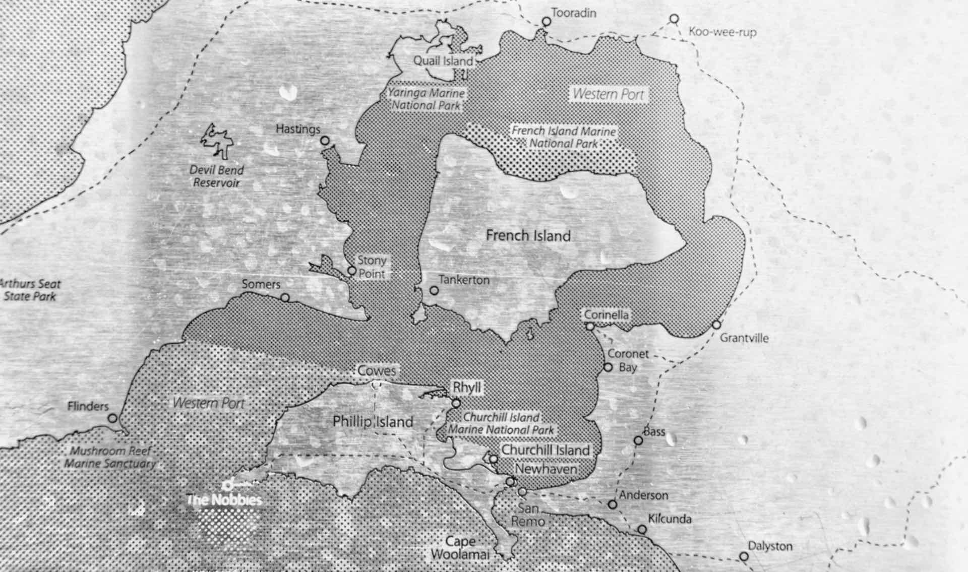 Clockwise from top left: Sitemap showing the location of Philip Island in relation to Melbourne; The Nobbies; Lyn with the Nobbies in the background; More of The Nobbies.