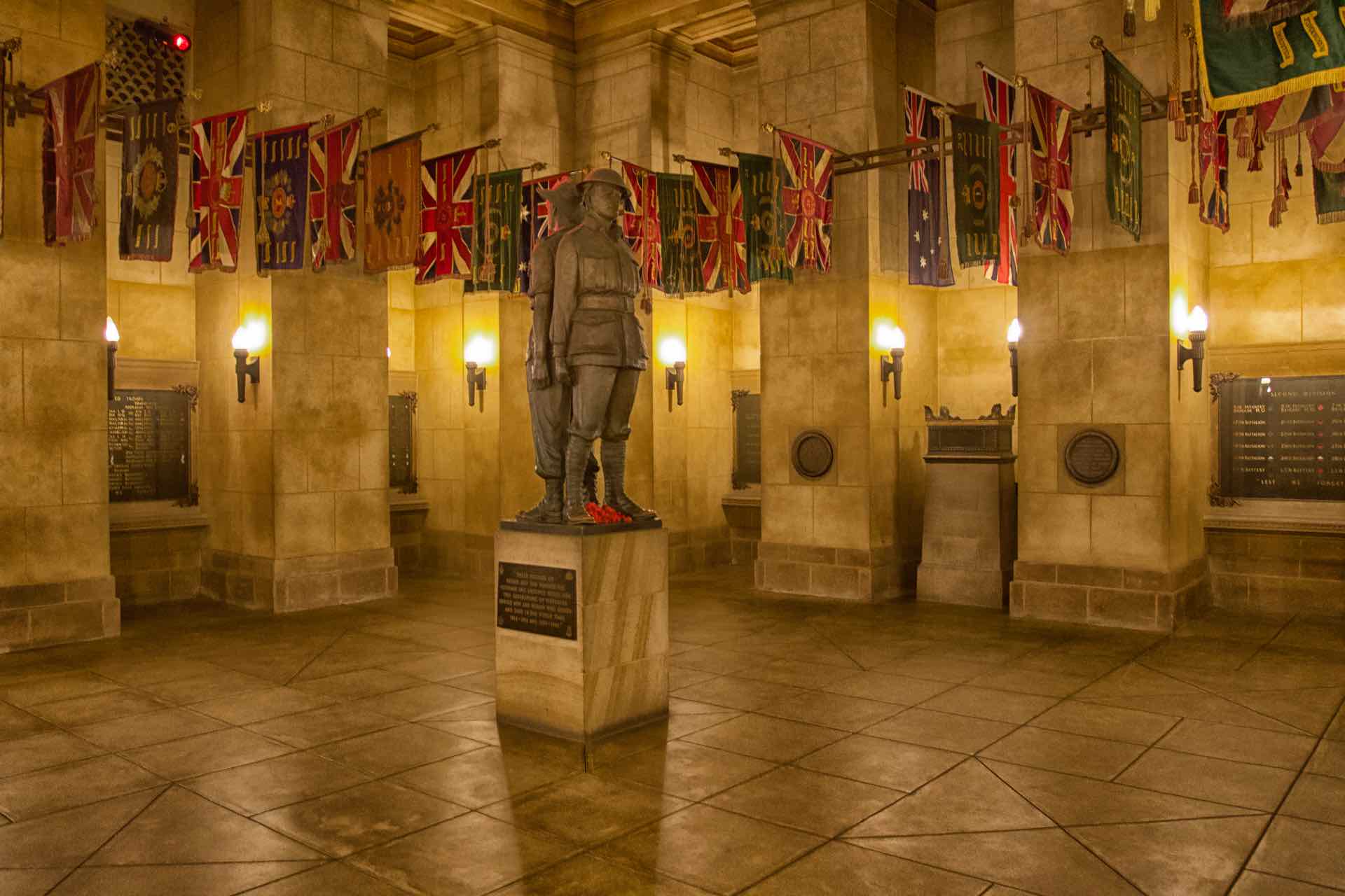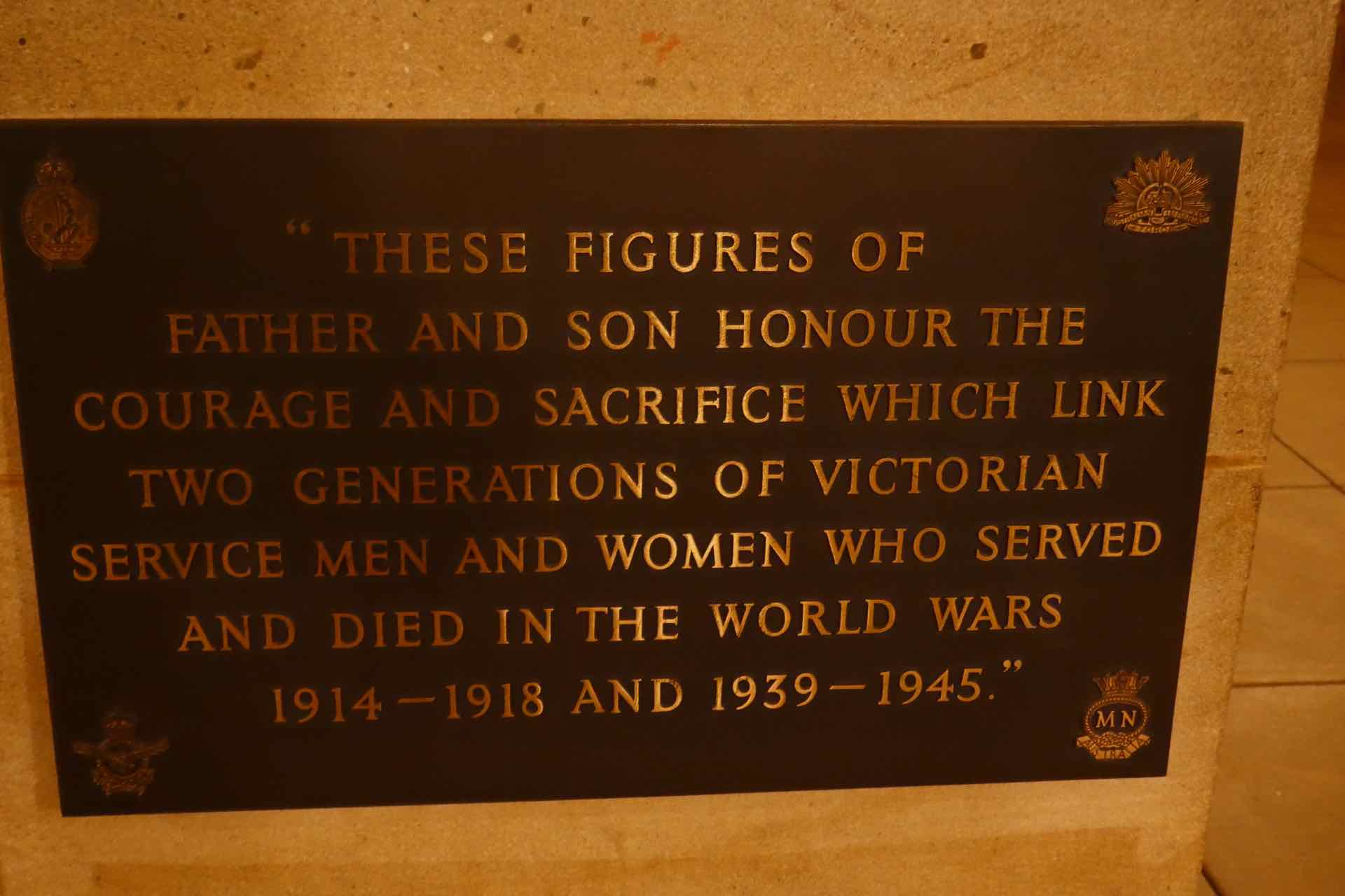 In the first Melbourne blog I mentioned Melbourne’s Shrine of Remembrance, close to the Botanical Gardens. Whilst Lyn was visiting the State Library to catch up with her writing, I took the opportunity to visit the Shrine again and explore what it had to offer. From the outside it is a huge, imposing structure, and inside is equally as impressive. A walk up the steps and through the entrance brings you to the Shrine, a simple stone square set in the ground with an inset stone representing a book cover. The inscription on the top of the shrine is simple, “Greater Love has No Man” (John 15:13). Simple, but thought provoking. As I was leaving, a small group from the Royal Australian Navy were entering, preparing for their own act of remembrance. Radiating out from the centre of the shrine are four corridors, each displaying a flag. A walk round the outer connecting corridor revealed stairs down to the galleries and Crypt. As the crypt was full of children on a visit I walked around the galleries.