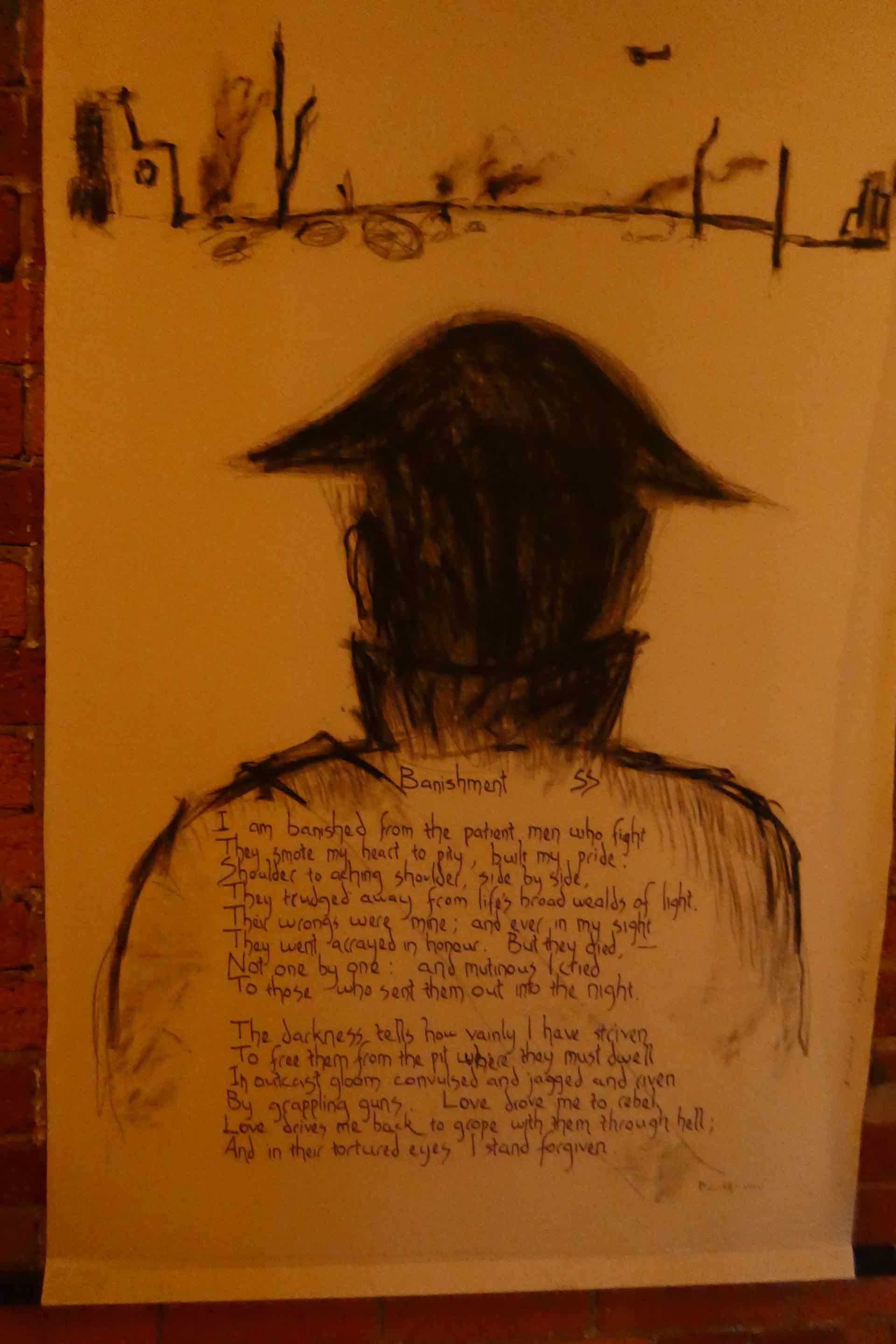 Bottom: Paintings by Craig Barrett based on poets work from the First World War. The poem pictured is by Wilfred Owen.