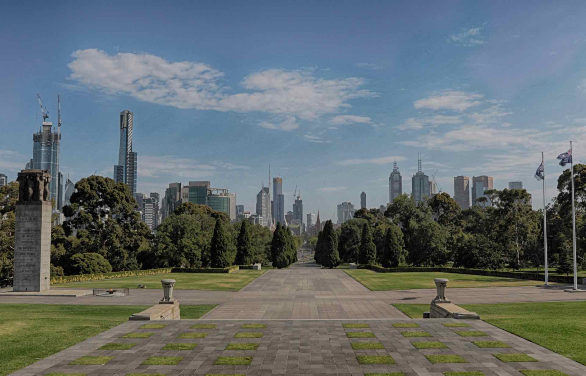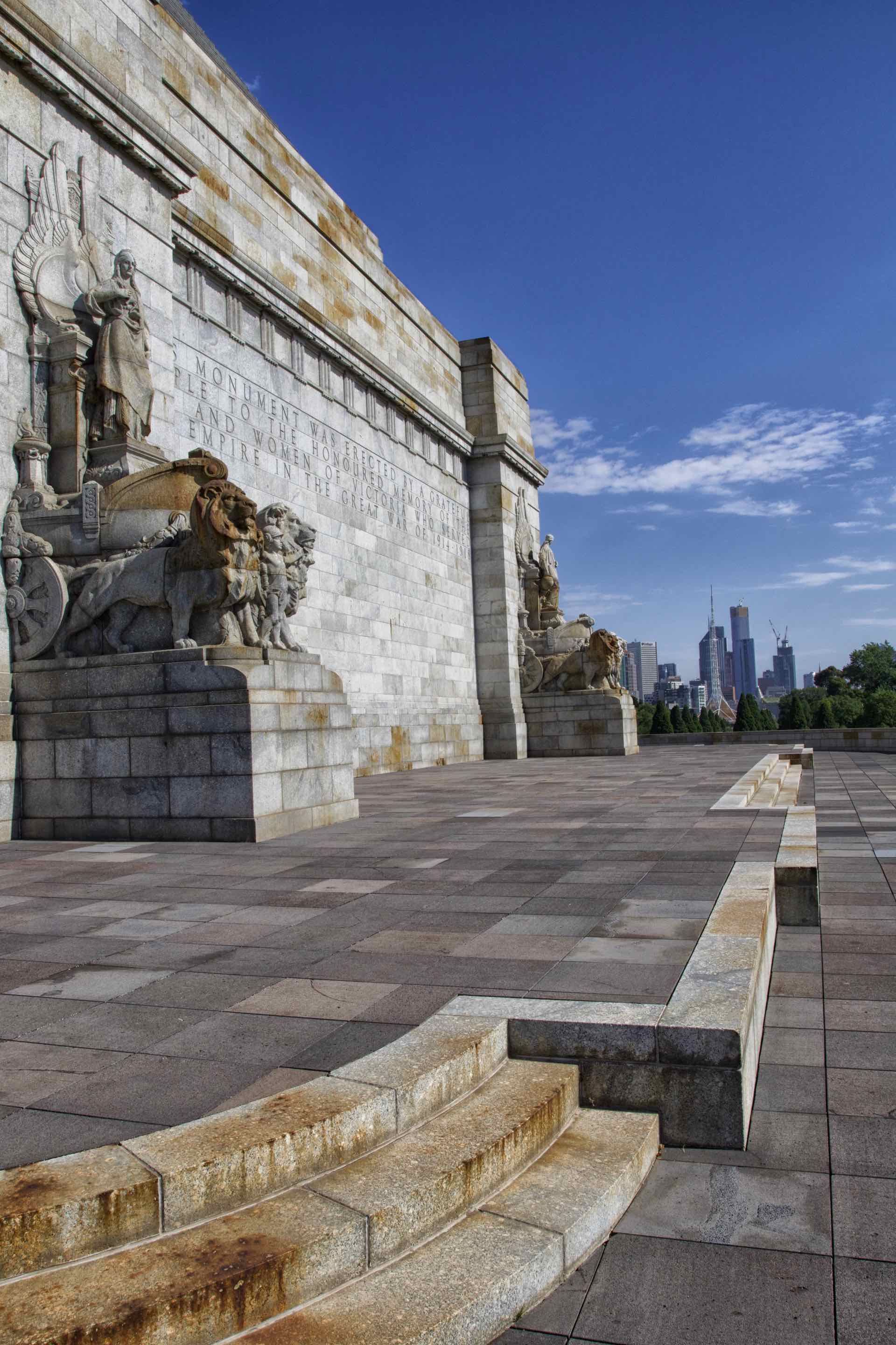 Top Left: Memorial and the Perpetual Flame; Centre: Commemoration and Dedication Inscription for Perpetual Flame; Right: Looking up to the front entrance to the Shrine; Bottom Left: Overlooking the Legacy Garden; Centre: Looking towards the CBD; Right: The side of the Shrine