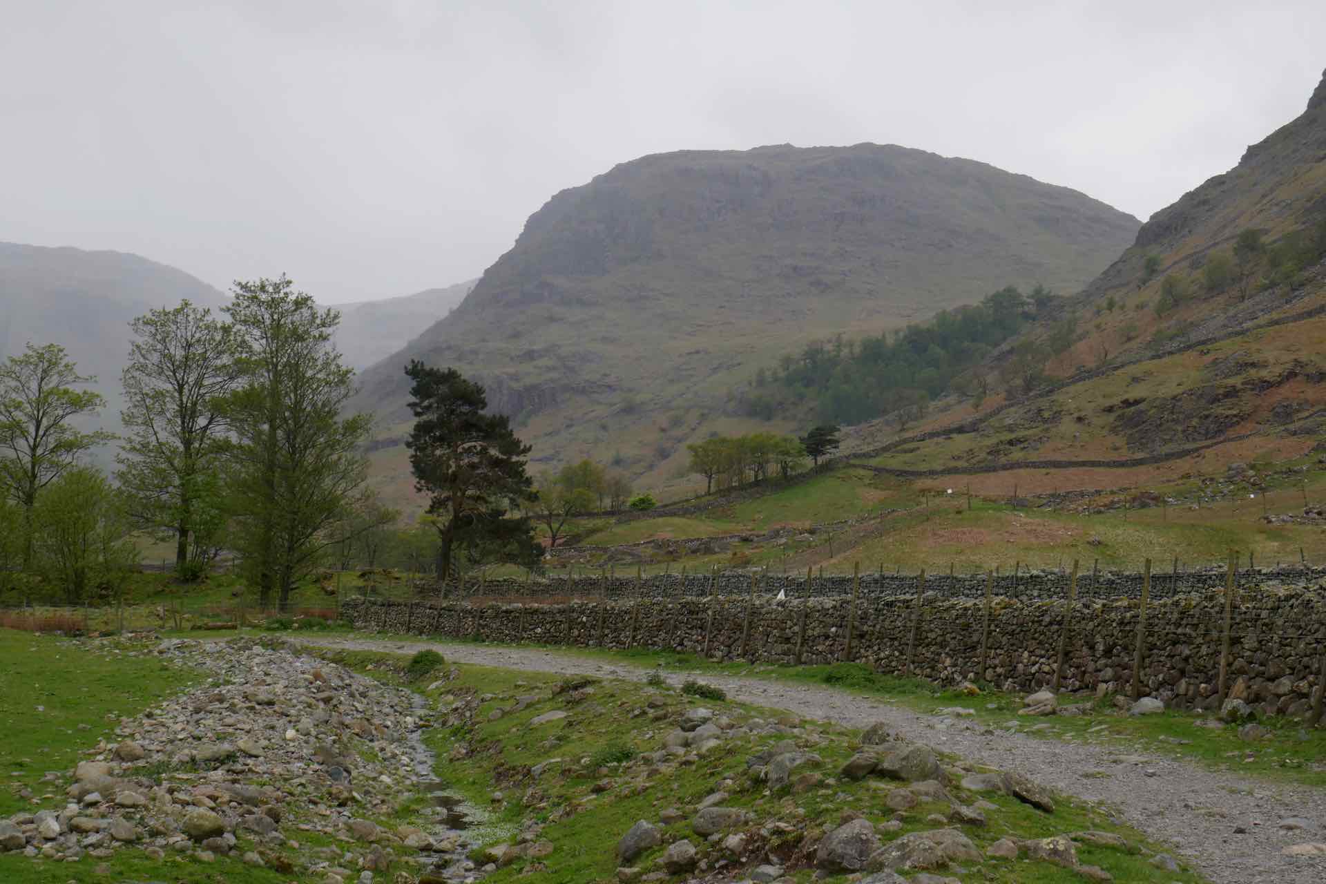 By this time, the wind had picked up little and we were starting to feel the cold again. The best way to get warm was to start moving so with that in mind we continued along the path.  Shortly after Sprinkling Tarn our trail turned left and we started the long descent, following the path above Ruddy Gill, the stream flowing down a deep channel below the path.  The path eventually levelled out as we approached Seathwaite Farm and the end of our walk. The walk was as I remembered, not really challenging but gave enough variety to keep us interested, both in the scene around about and the path to follow.