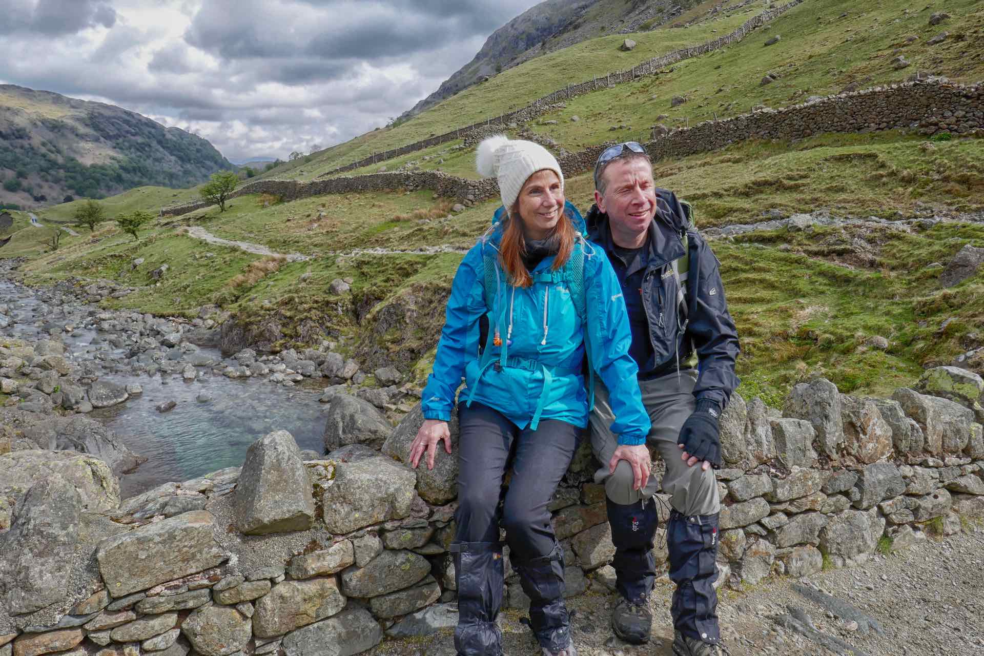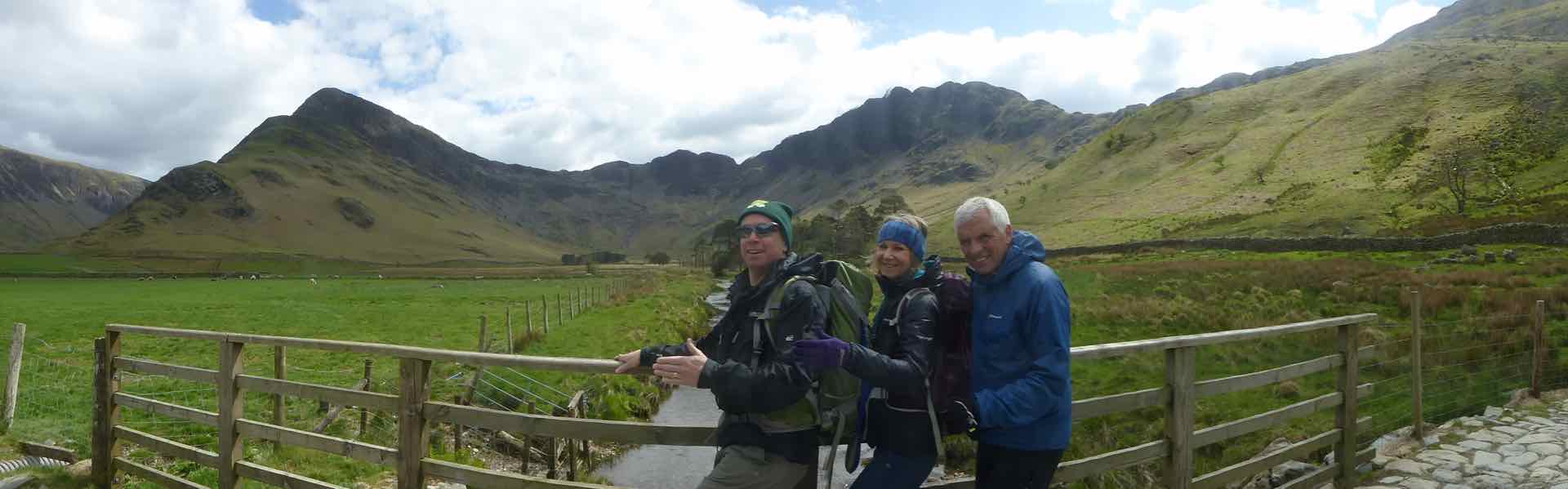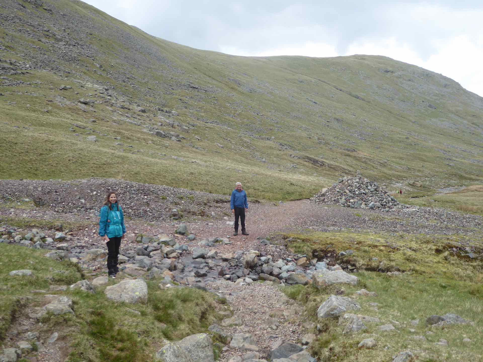 Top: Start of the climb up to Styhead Tarn: Centre: Lyn and I rest on a bridge; Bottom:  Tim and Jo rest on a bridge