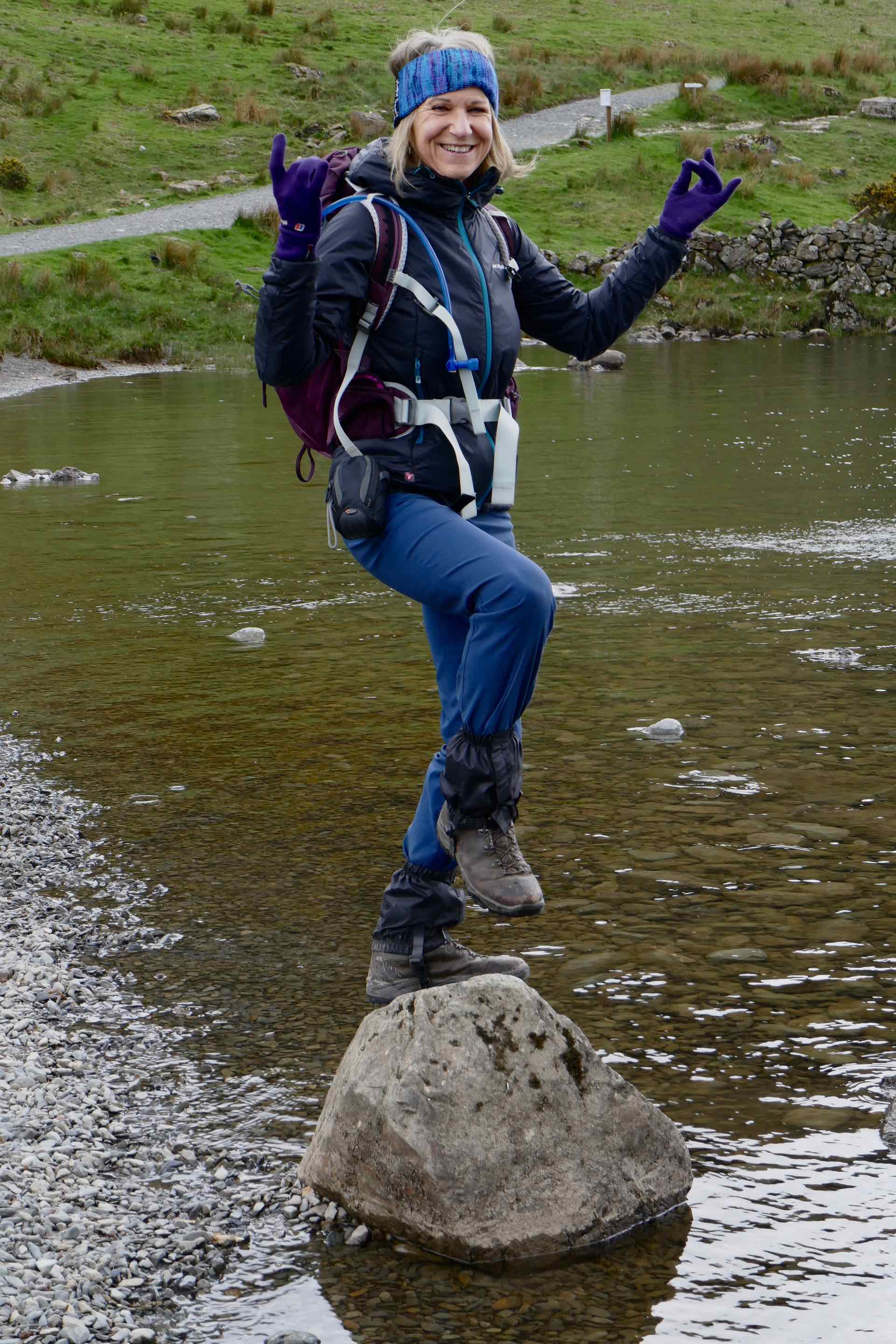 Clockwise from top left: Tim falls in; The four of us with Fleetwith Pike and Haystacks in the background; Jo poses; Lyn poses on a rock.