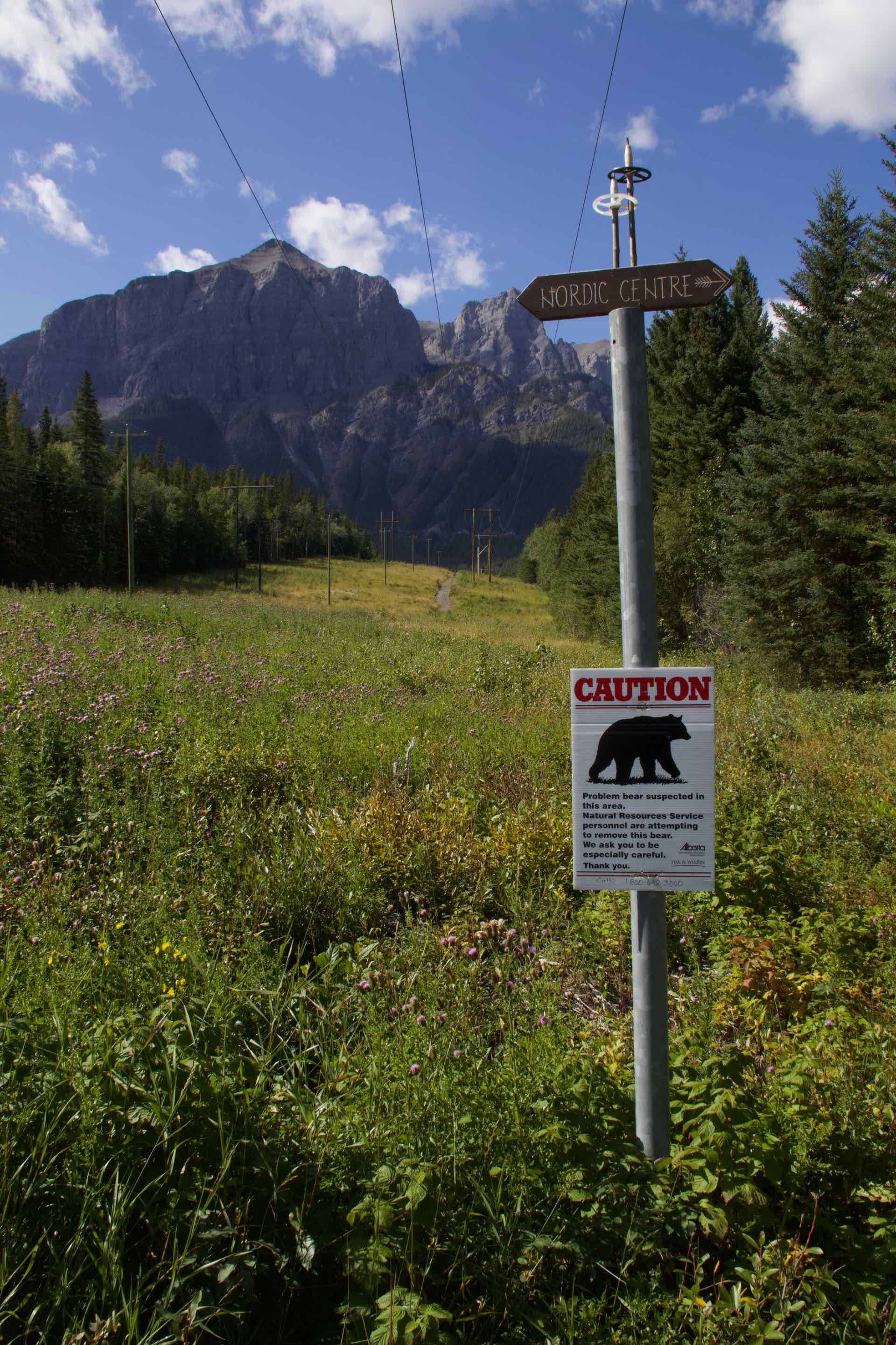 Our accommodation is about a mile from the town centre and we got our first taste of “wildlife hazards” when the receptionist warned us of a young bear occasionally frequenting the grounds looking for food. It is their time for scavenging prior to hibernation, so they are looking for around 17,000 calories per day to build up their energy stores for the “long sleep”.  So far we have not seen it. We were advised to carry bear spray (supplied free by the hotel) if we went out walking the many trails around Canmore. Everywhere we went outside the main commercial centre of the town, signs were up warning of the presence of these not so cute and cuddly creatures.  General advice was, don’t go out alone, talk loudly to ward off the bears,  and back away slowly.