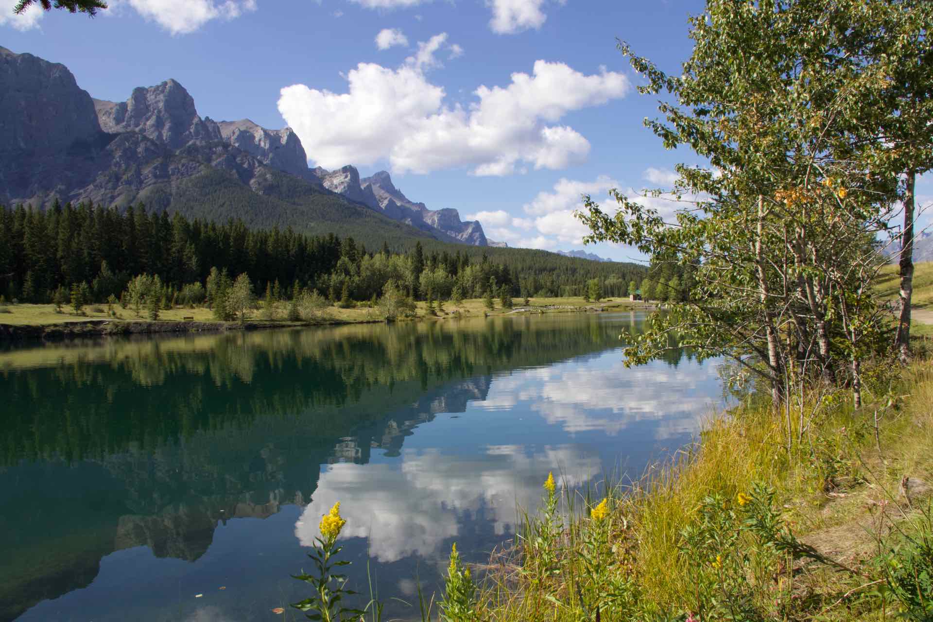 Clockwise from top left: Quarry Lake near Canmore;  Another view of Quarry Lake; One of the locals, A dragonfly; A dragonfly stands by!; Bear country, a sign advises caution; Flowers in the sun