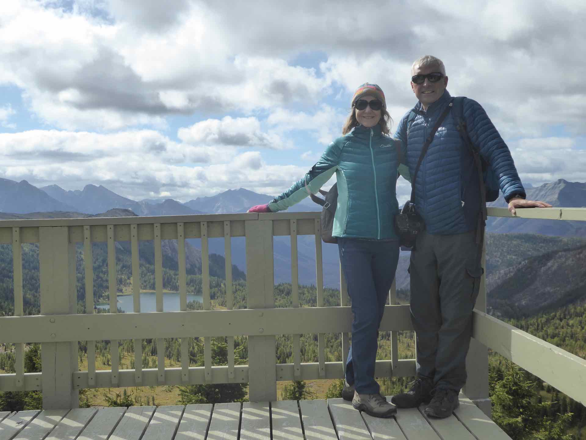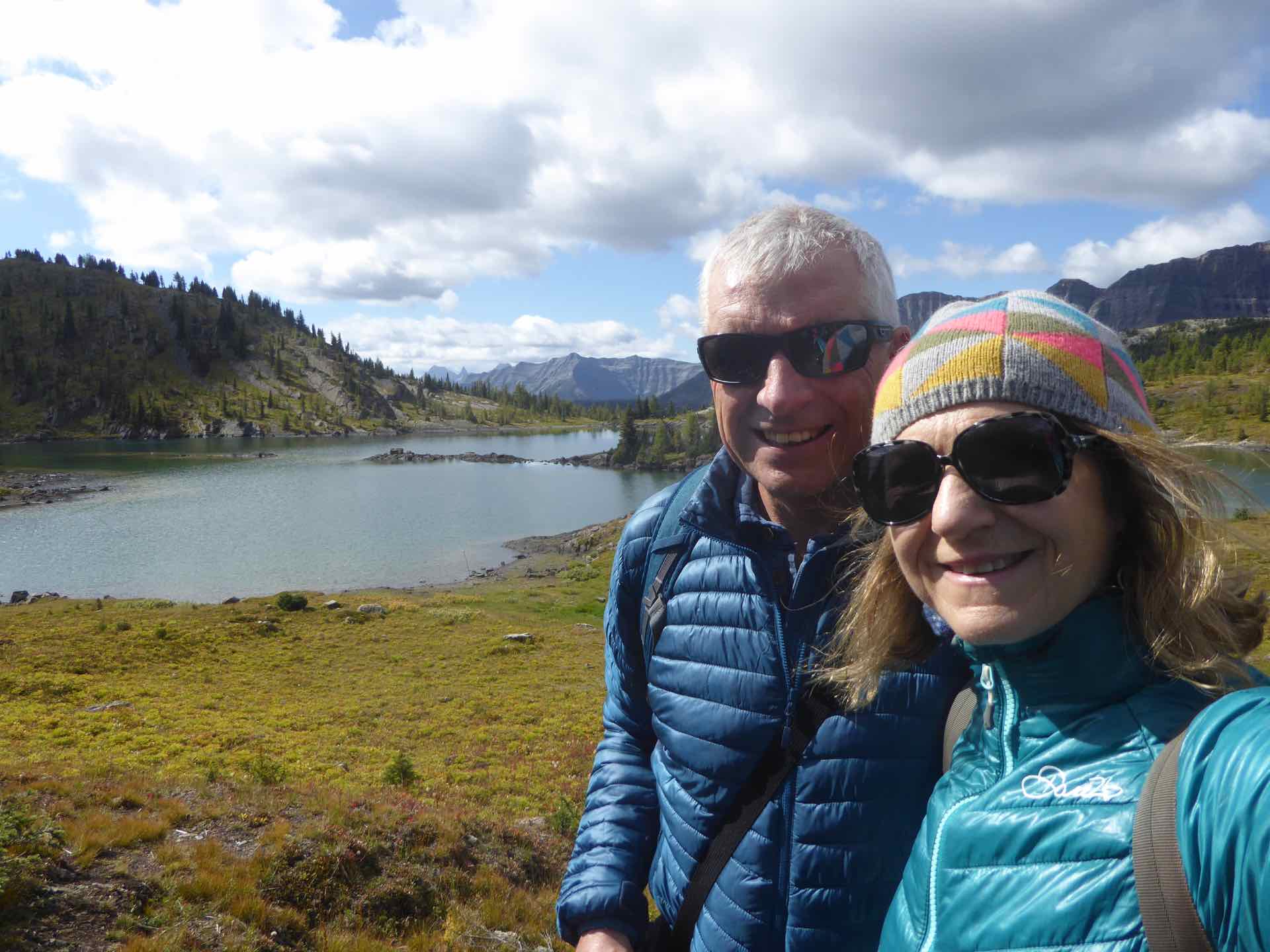 L-R:  Canmore Memorial Garden; Lyn on the walk to Canmore centre; Us on the bridge over Bow River.