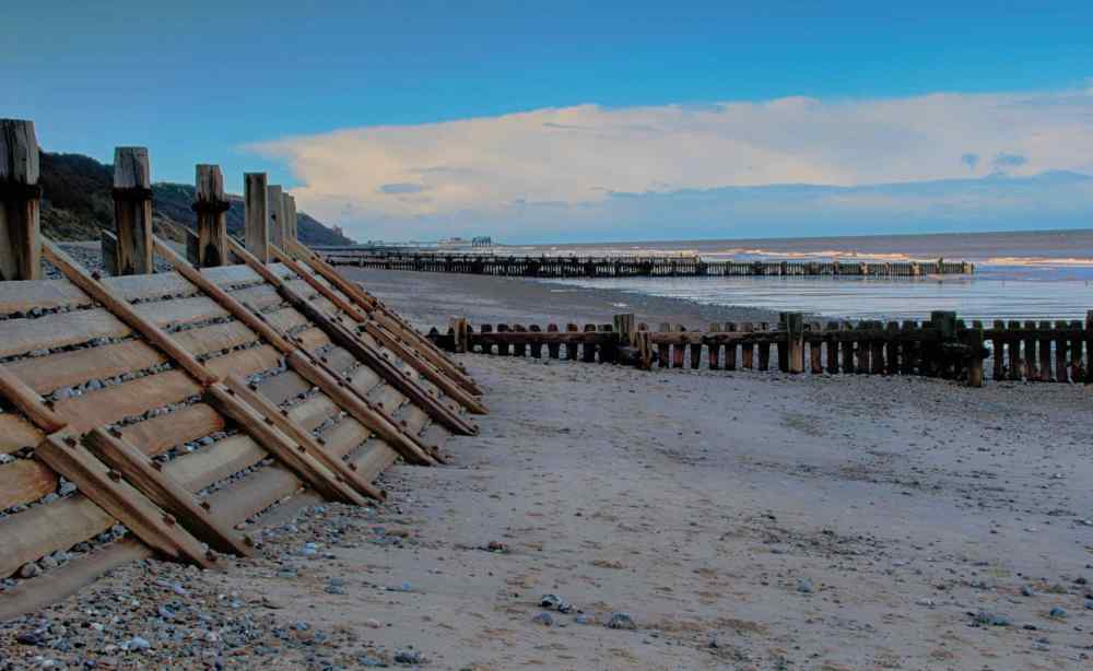 Top: Sea Defences at Overstrand; Bottom: The beach and receding tide – Overstrand