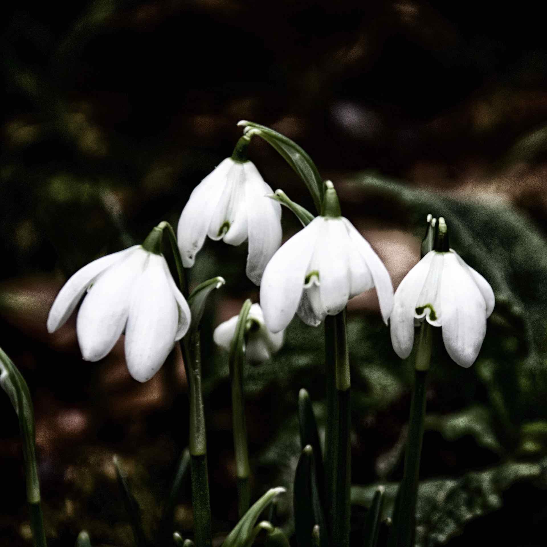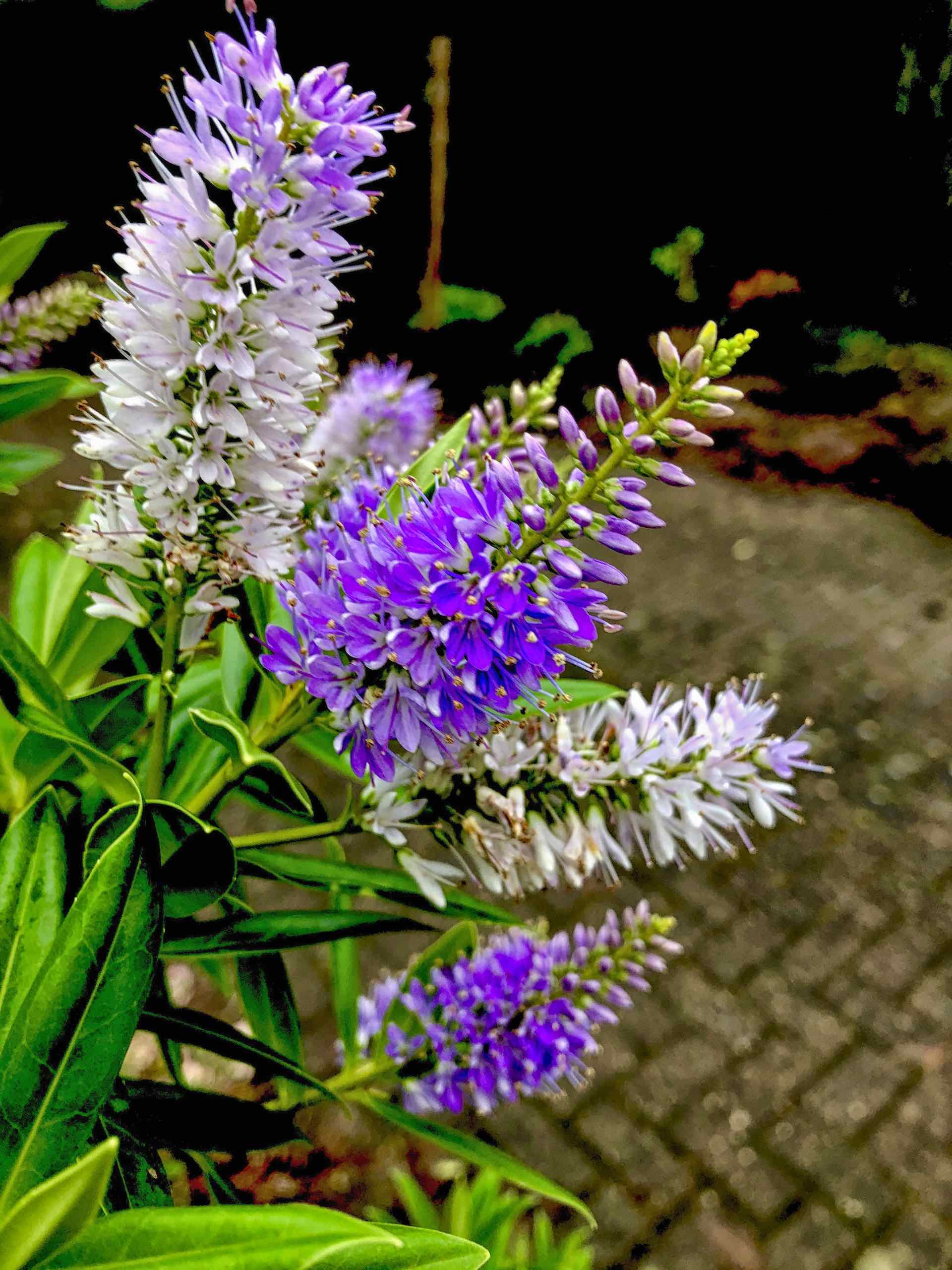 Top row: Snowdrops in our front hedge. Bottom left: Beautiful white flower of unknown variety, inherited when we moved here. Bottom right: Hebe flowering in January. This plant always flowers in June!