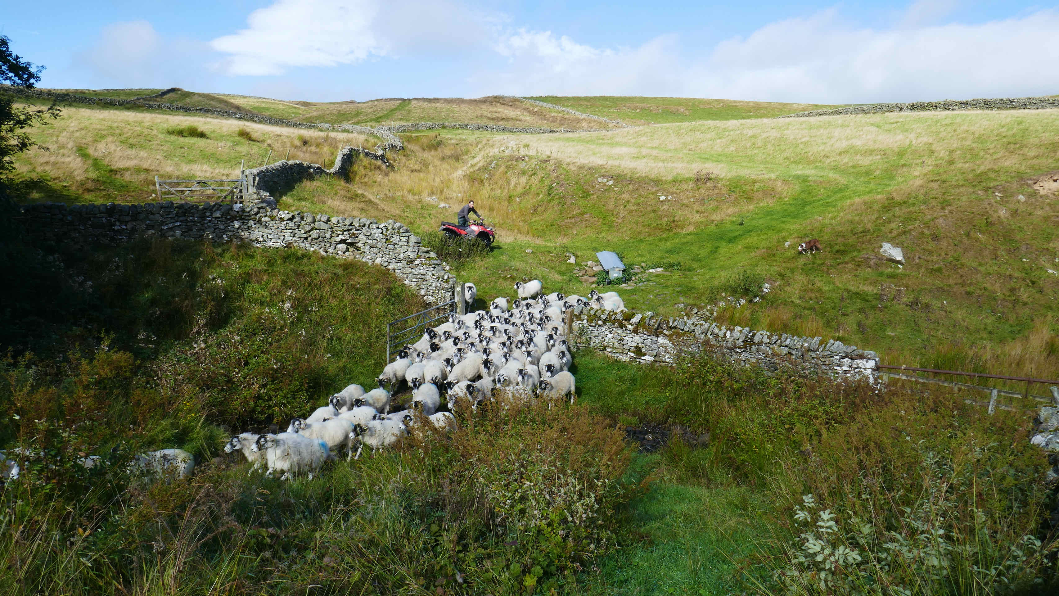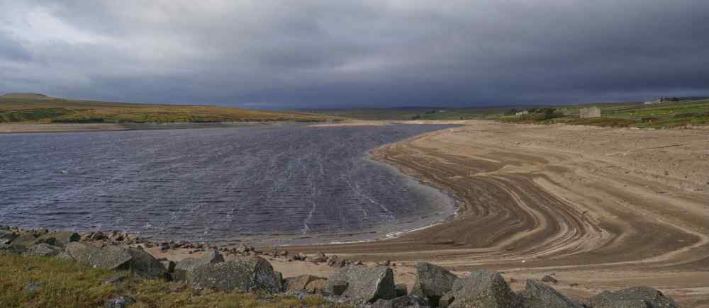 The rain eventually gave way to fluffy cloud and intermittent sunshine . Our route took us from flat paths and trails alongside another reservoir, this one partially empty for maintenance work, back into the hilly dales landscape of pasture and dry stone walls. At one point we watched in fascination as a farmer on a quad bike with his two collie sheepdogs helped him successfully manoeuvre a large flock of sheep through a narrow gate and along the track we had just walked down.