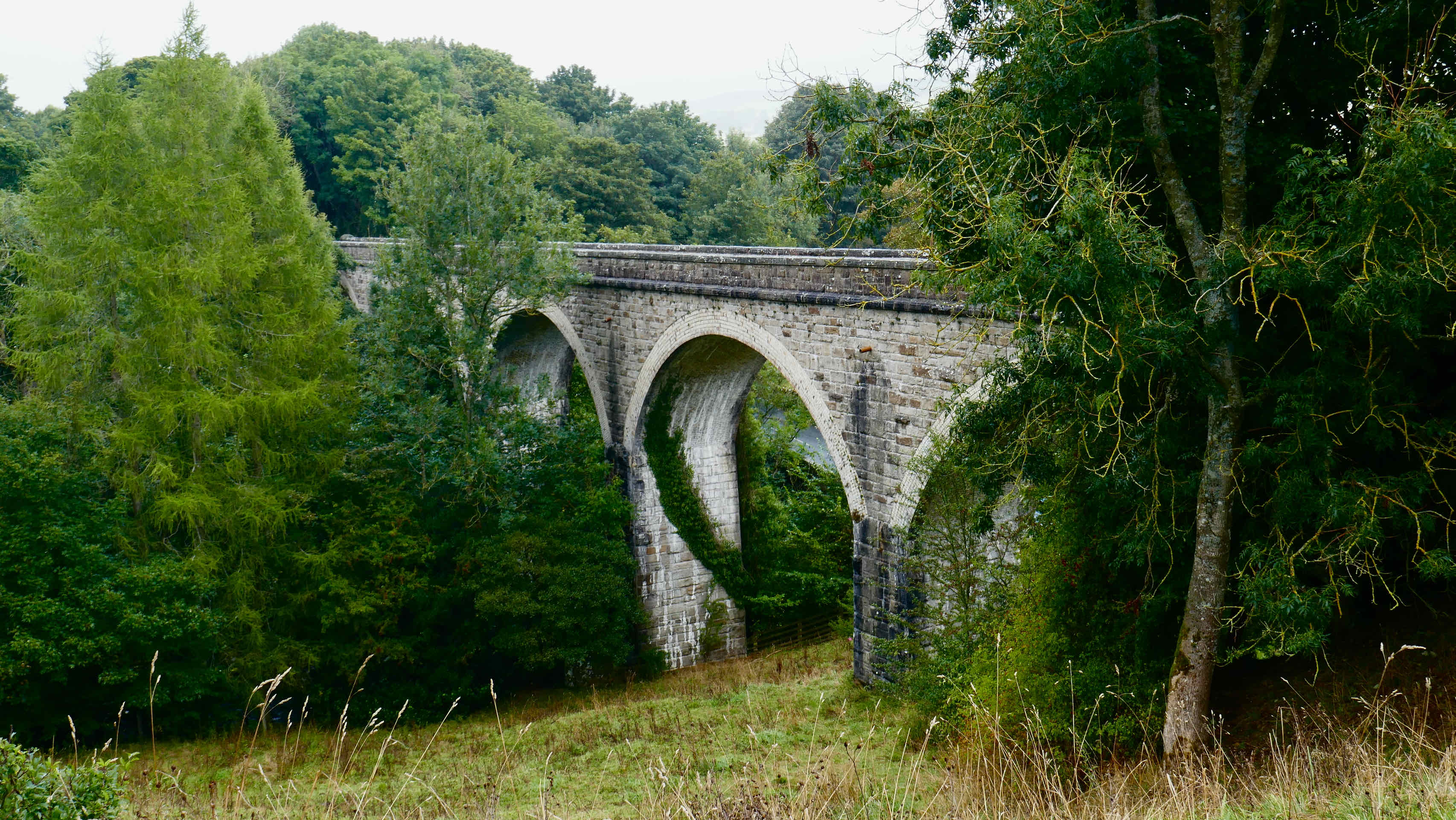A quick search on a mapping app revealed an 8 mile low level route starting from the village centre we could follow so after finishing our drinks we headed off on our walk. It was still breezy and squally as we turned off the road along a riverside path which led up through a stinky farm yard onto a low hill and across fields. Part of the path followed an old disused railway line and this afforded us some lovely views through the drizzle into the valley. At one point, the sun burst through the clouds and we were treated to weak, watery rainbows as we looked on from our elevated viewpoint.