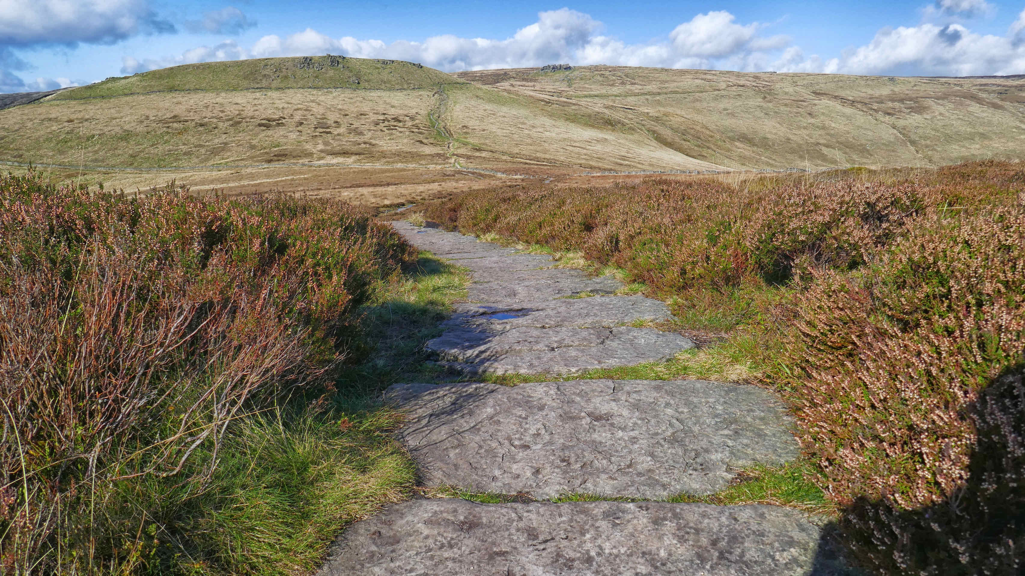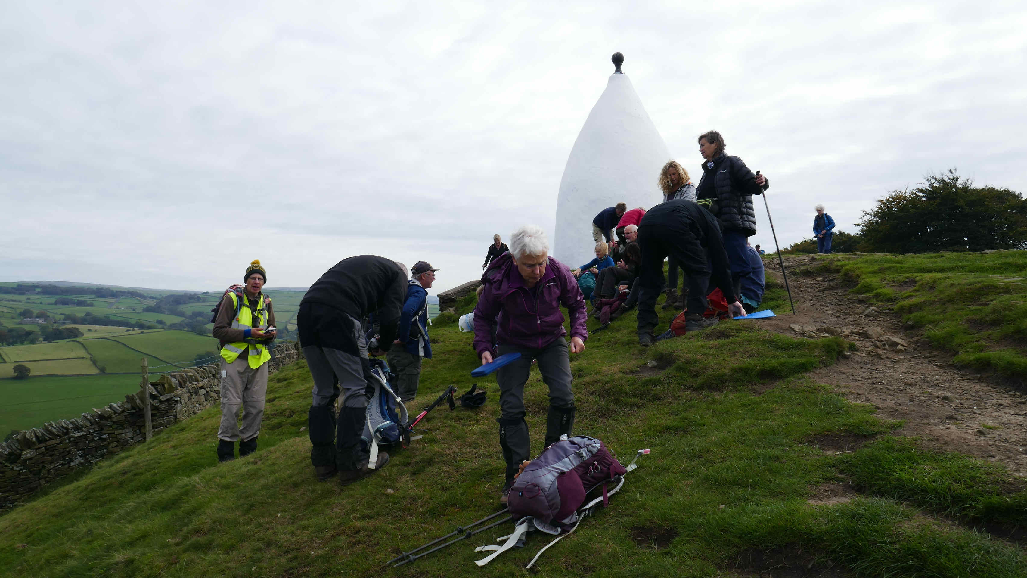 From here, despite the misty weather, the views across the moor were amazing. To the northwest we could make out the tower blocks and tall buildings of South Manchester, a reminder that civilisation was not so far away, even in this remote area. The walk took us on to Lamaload Reservoir and Saddle of Kerridge where we stopped for lunch by a monument known as White Nancy. This monument was built in 1817 by a local land owner to celebrate the victory at The Battle of Waterloo. The original structure had an entrance with benches inside but more recently the structure was sealed. Over the years it had had its white painted surface adorned to celebrate certain events, such as in 2012 when a Jubilee Crown and Olympic rings were added to celebrate those events.