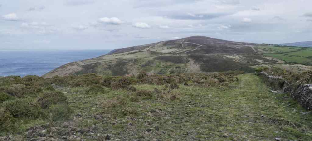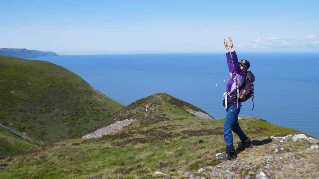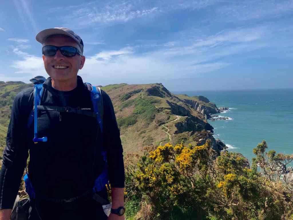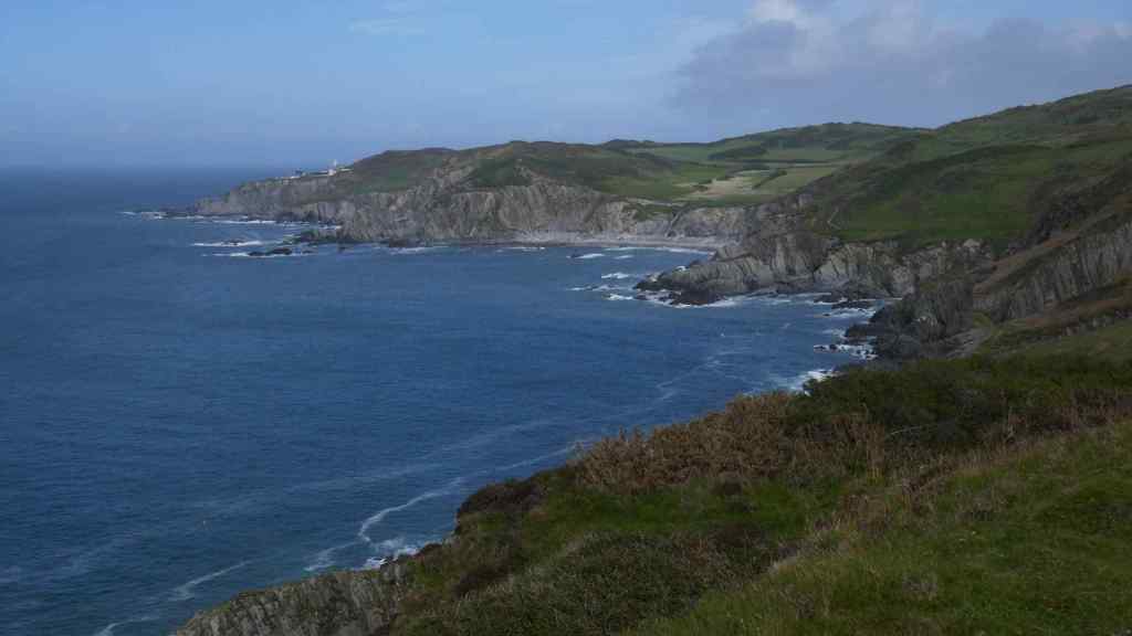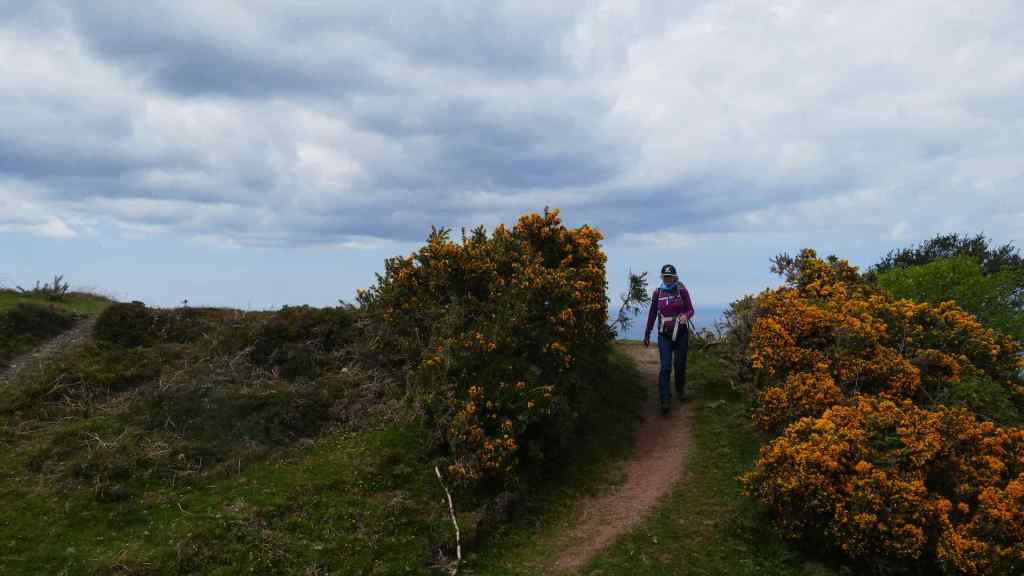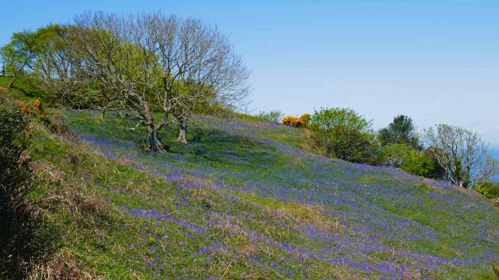 We soon had to make a choice of route, the path over the hills and moorland, or the “Rugged Path”. We chose the latter. This route meant a longer walk on a narrow path of steep climbs and descents, but which afforded us spectacular clifftop views of the coastline, yellow gorse and bluebells, and in the distance the coast of Wales which stood out in the bright blue sky. It was not named the “Rugged Path” for nothing. It was a spectacular route and very rewarding.