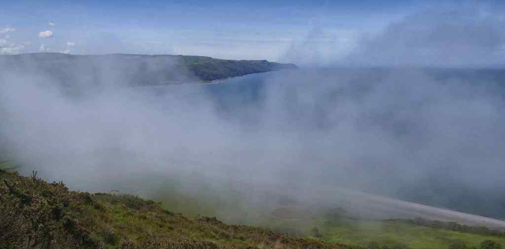 We did not appreciate it at the time but this was the end of the hilly section of our walk and as we walked into Woolacombe the coastline appeared to level out around the bay and more ominously, the path round the point towards Cryde Bay, our route for the next day, was covered in spray and mist.