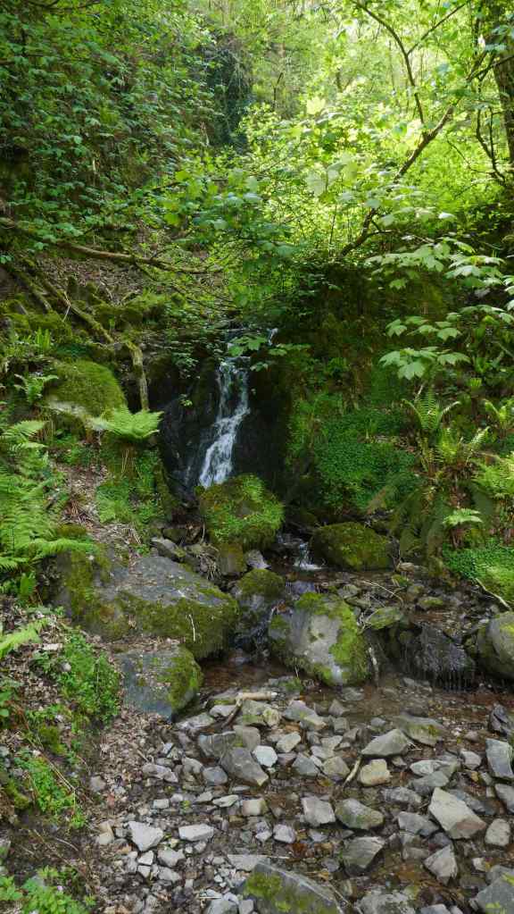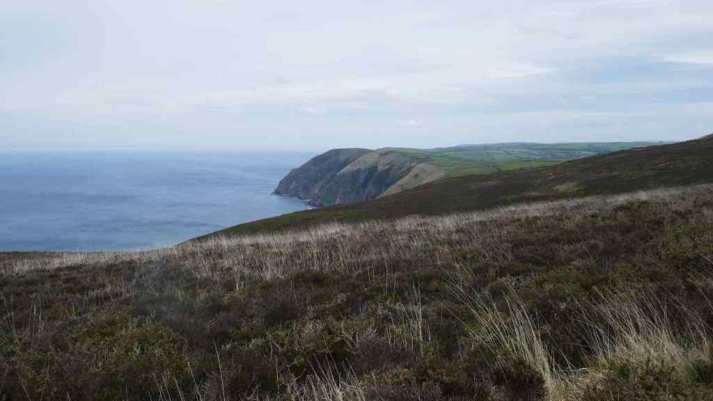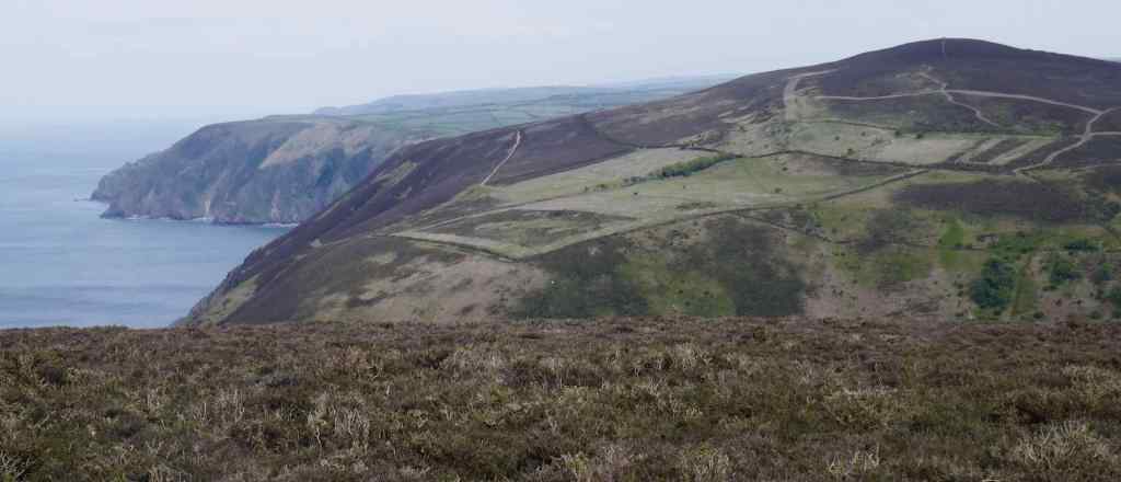 Our lunch stop was just off the cliff path with a sheer drop beneath our feet. On the map it was named Desolate, a very apt description, despite the area now being bathed in sunlight and making walking much more pleasant there was not another soul around. Another, longer diversion because of path closures saw us take the path over Countisbury Common, an open path across lush green pasture with a farm nestling in a dip and a herd of cows grazing quietly on the grass. We reached a narrow lane with a long steep twisty descent to eventually meet the designated route again. The trouble is if you walk down a hill, you invariably have to walk up a hill again and so it was we started to climb again.