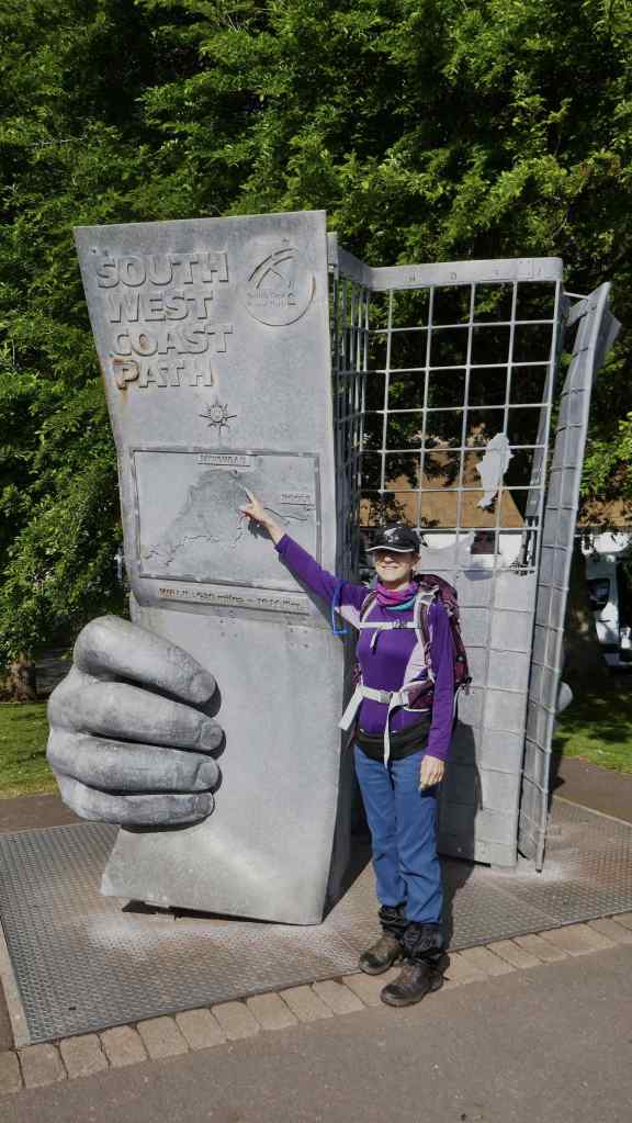 We made our way to the sculpture that signifies the start of the South West Coast Path and after posing for a few photographs we set off on the trail, pleased to be walking point to point once again. A short flat section along the west end of the promenade gave way to a wooded steep climb on to North Hill.