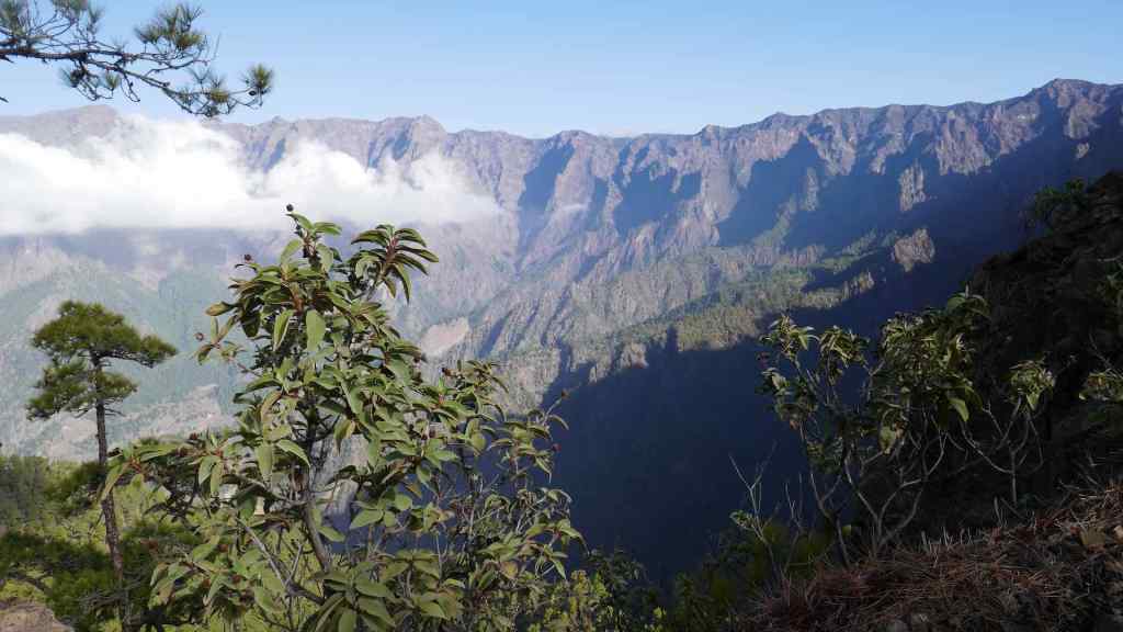 La Palma has one other unique feature. The atmosphere above the island is unusually stable, which means that it is an ideal location to site astronomical telescopes. One walk took us up to the observatory at the top of Roque de los Muchachos which is the site of an observatory of the same name. The “fleet” of telescopes features some of the largest in the Northern Hemisphere and have been established at this location since the 1980’s. At nearly 8000ft it was cold but sunny and scattered banks of snow dotted around the observatory site let us know we were high up. The observatory sits close to the Caldera de Taburiente and a previous walk a few days earlier saw us take a route up the other side of the Caldera on to the Pico Bejenado where the telescope domes could just be seen nestling in the peaks. Both of these walks had spectacular views as can be seen from the images.