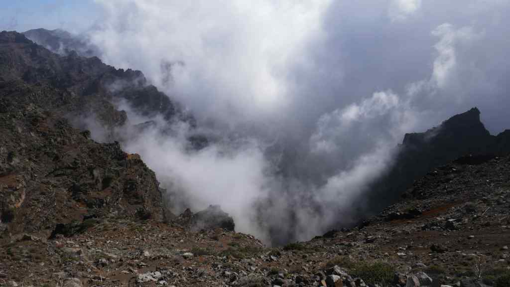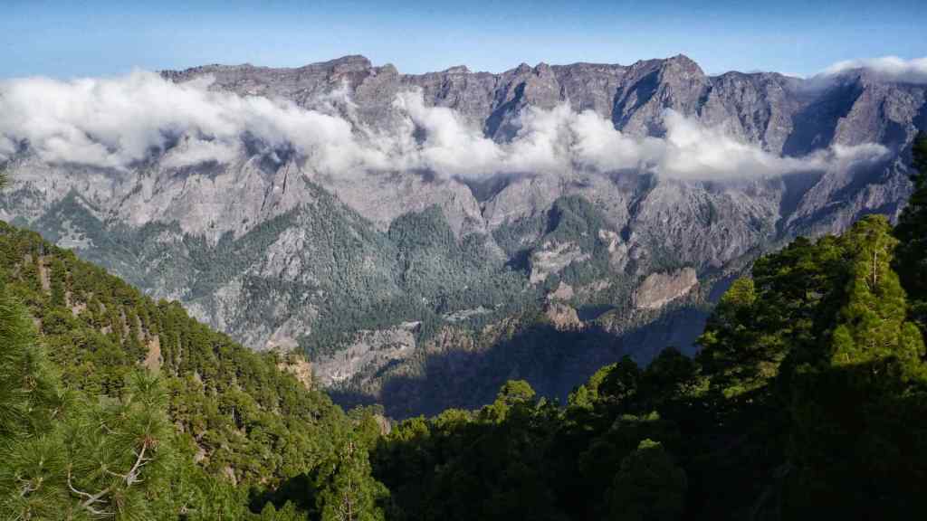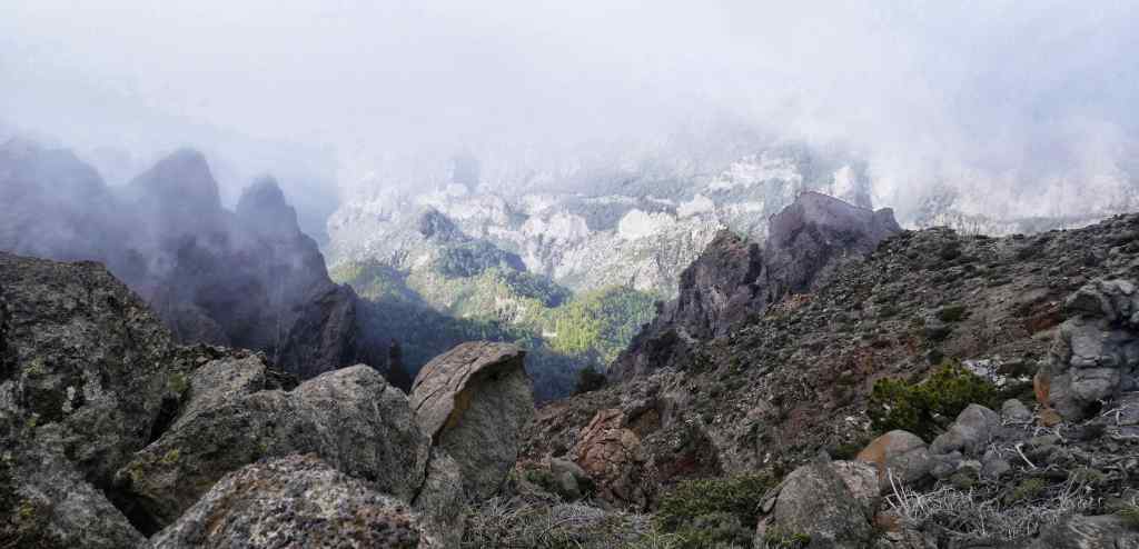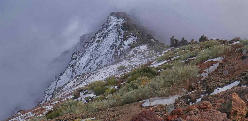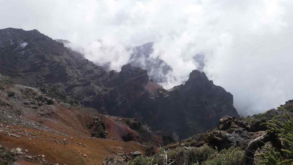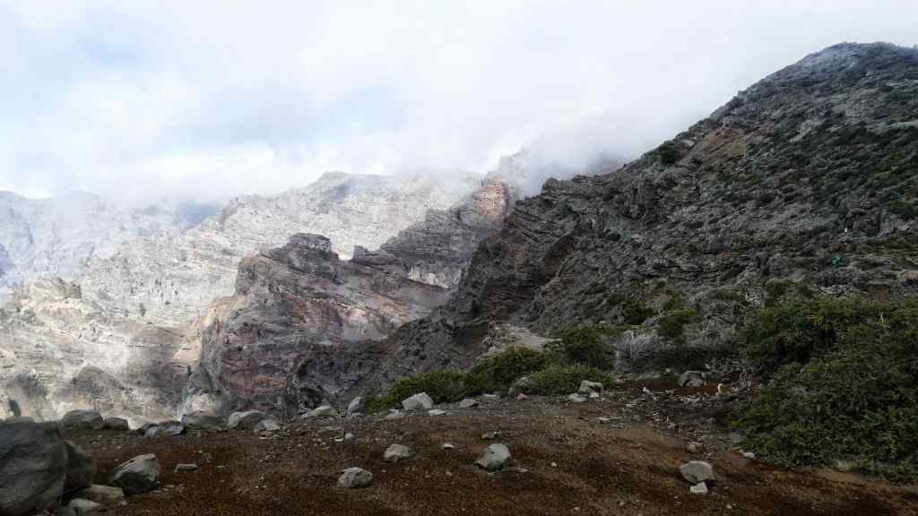 Top: Misty view into the Caldera de Taburiente Bottom: The path towards the Observatories – it goes around that mountain peak!