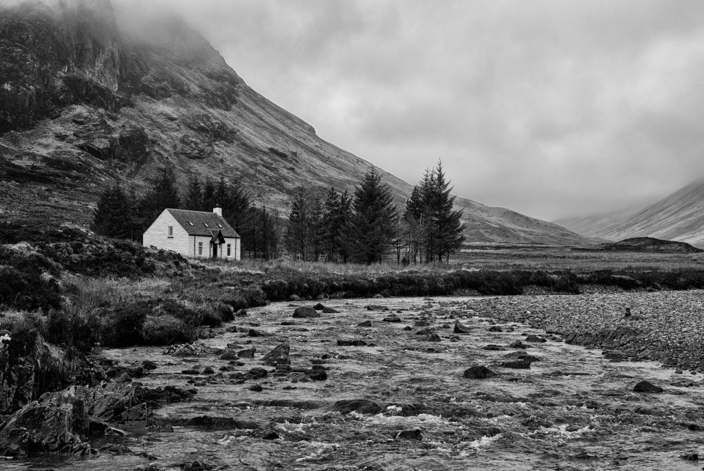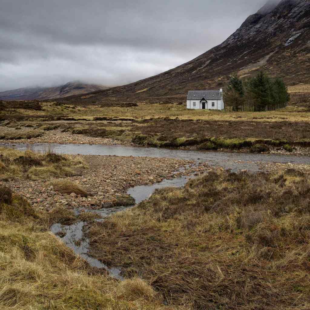 Our last day started dry, but did not last. Our first destination was a short drive from our base. Along the main road through Glencoe are dotted a small number of small white cottages/huts set back from the road. Our first location was one of these little huts. Known as Lagangarbh Hut, it belongs to the Scottish National Trust, though I do not know its origins or what it was used for. It is remote!