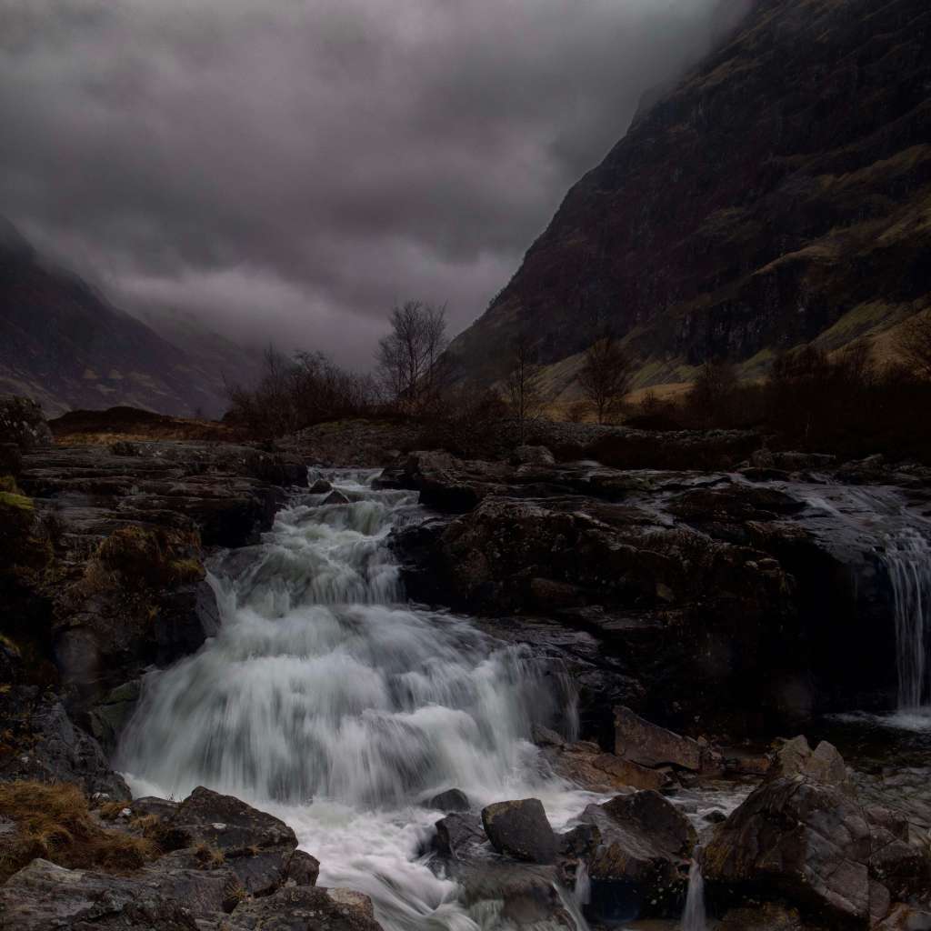 Like many glen’s in Scotland, Glen Etive has more than its fair share of waterfalls and they offer challenges for a landscape photographer around composition and water flow etc. As we journeyed down Glen Etive we stopped at a couple of the larger falls. These image’s are below: