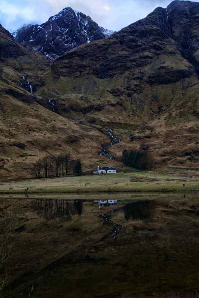 Centre: Tiny cottage, large mountain behind. This shows the scale of the Glencoe range.
