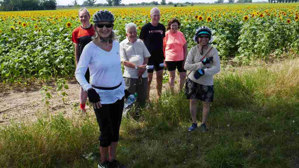 The cycle path cris-crossed fields brimming with crops, from wheat, barley and sunflowers. Yes, acres of sunflowers all with their yellow heads reaching up for the sunshine burning down on us. It was a glorious sight. Although the wind had slackened off, the heat made our ride hard work and we enjoyed frequent stops throughout the day, to rest, refill water bottles and try and cool down as best we could.