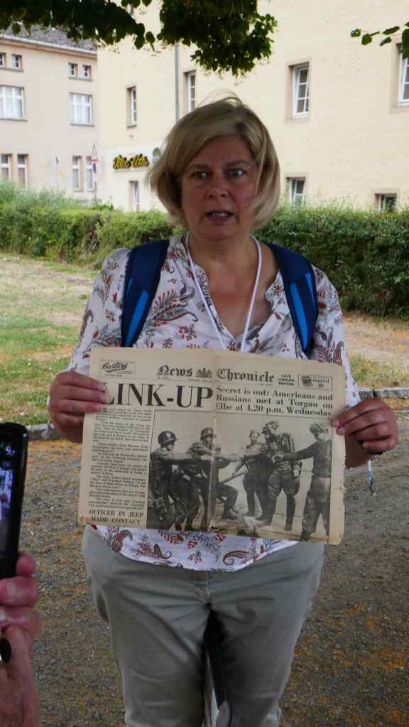 Top: View from the meeting point – Americans on the left bank, Ukranians/Russians on the right. The Russian party crossed via a bridge behind our position. Bottom: Our guide holds up a newspaper from the day in 1945