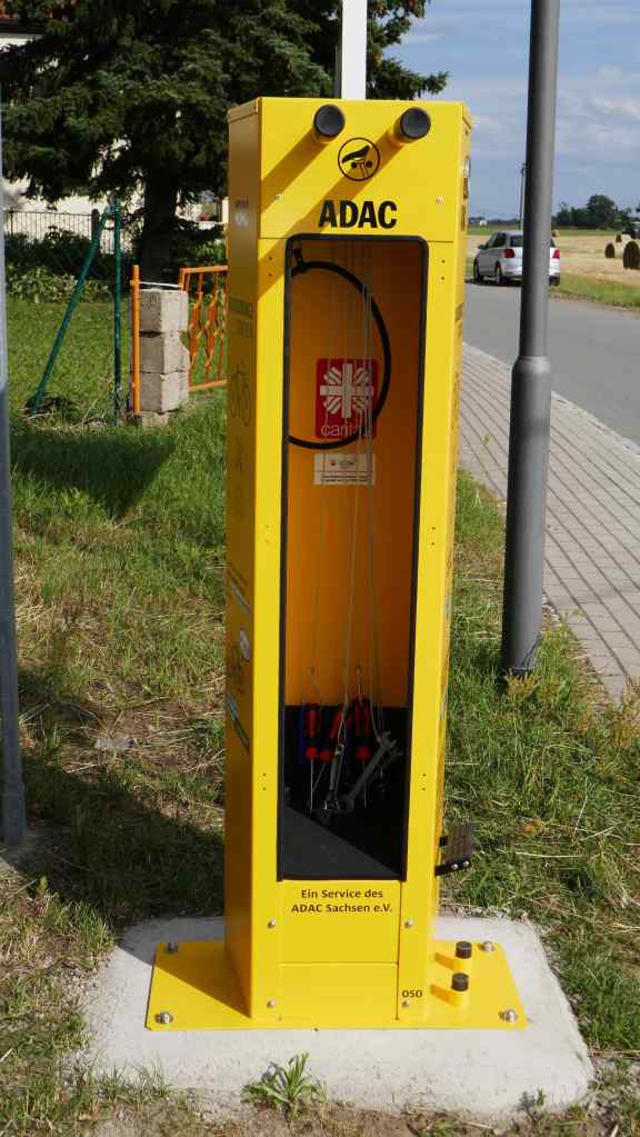 One of the joys of these trips is occasionally coming across something strange yet oddly practical. Just outside an un-named village we stopped by a what can only be described as a “bike fixing post”. A bright coloured metal container with spanners, tyre levers etc, and a pump, all intended for bicycle repair.
