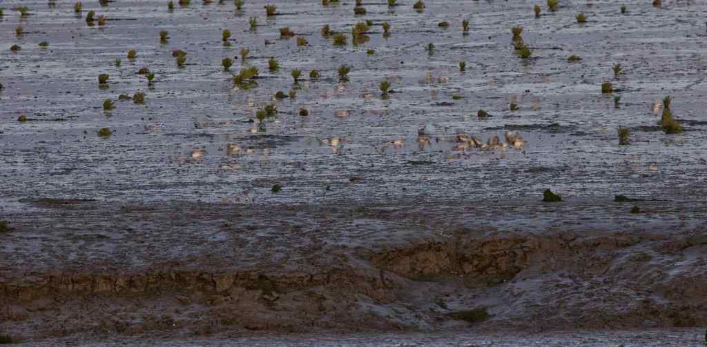 Top: The Old Jetty at Snettisham – The tide is out; 2. A few wading birds feeding on the mud flats close to shore; 3. A few birds get airborne; Bottom: The first mass launch.