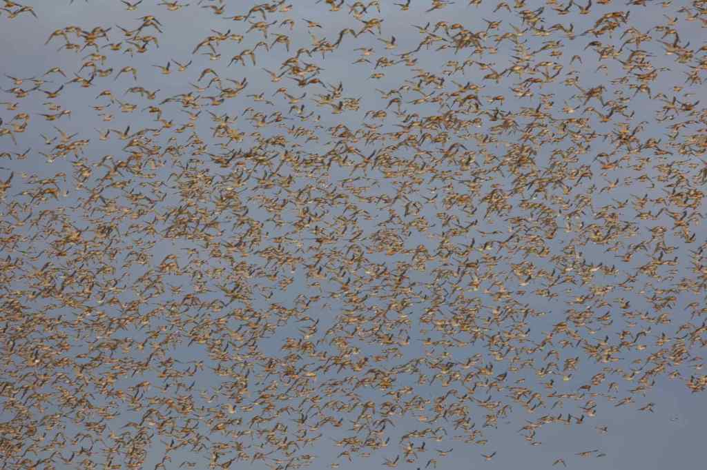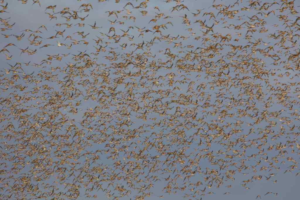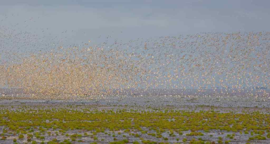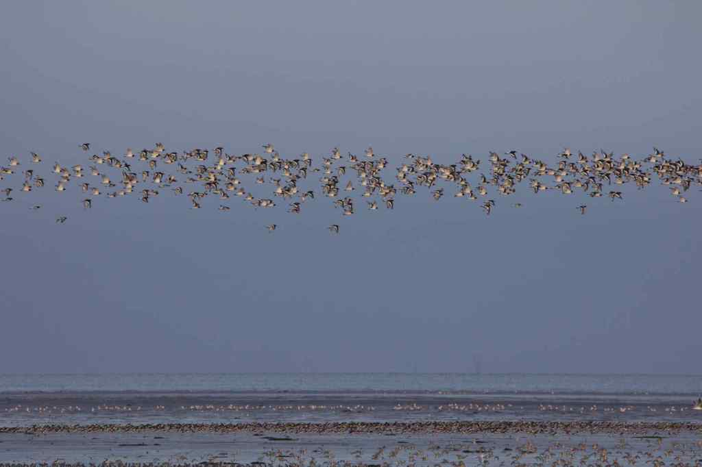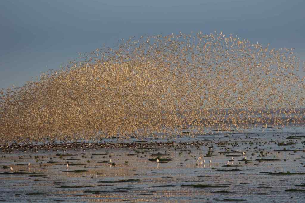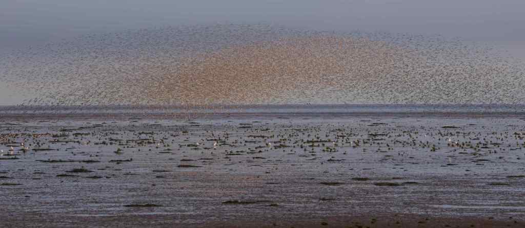 Thousands of wading birds, mainly Knots feed daily on the muddy beaches around The Wash in North Norfolk. These areas are rich in the Knot’s favourite food; worms. At certain times of the year excessive high tides occur which drive the flock of feeding birds further up the beach and eventually on to the lakes slightly inland. The birds rise up as one amorphous mass and swoop and swirl around before settling back on the sand/mud, before being forced to move again because of the advancing water.