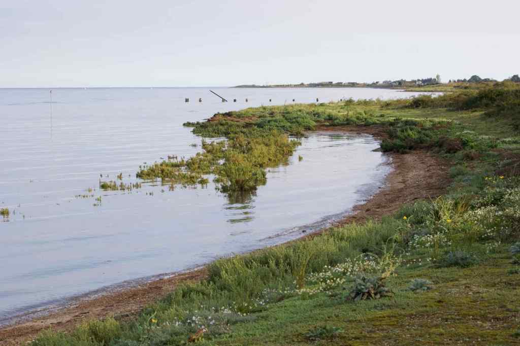 The Tide’s In!! Top: Panorama shot of the shoreline with the tide in; Centre: Looking back up the bay with the tide in; The landing stage at Snettisham – The tide is now in!