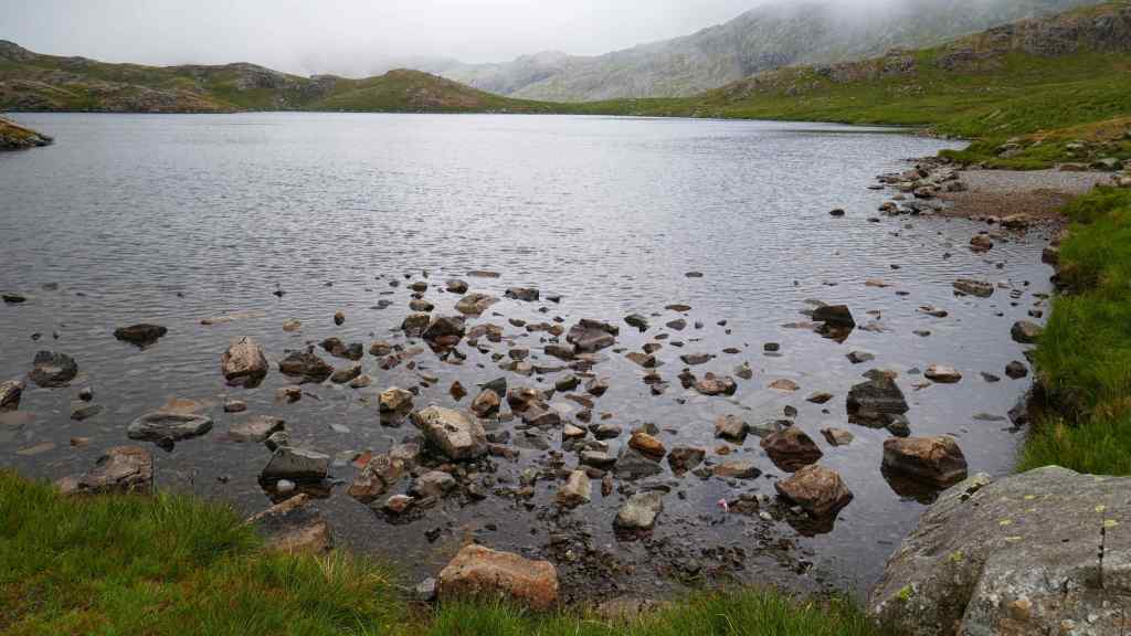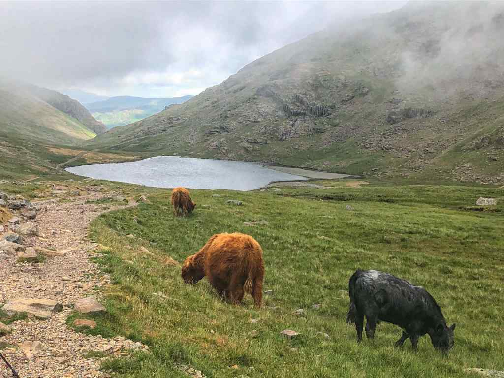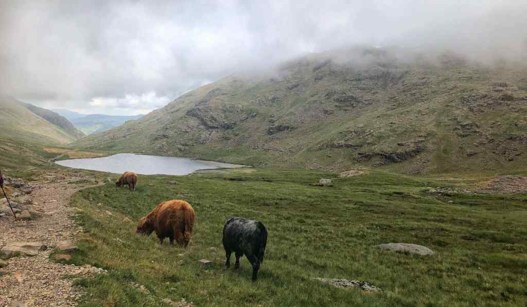 Styhead Tarn – The low cloud cooled the temperature and blocked out views of the Gables (Green and Great), Great End, and Broad End. Navigating to Sprinkling Tarn was made little more difficult because of the low cloud.