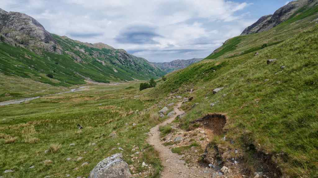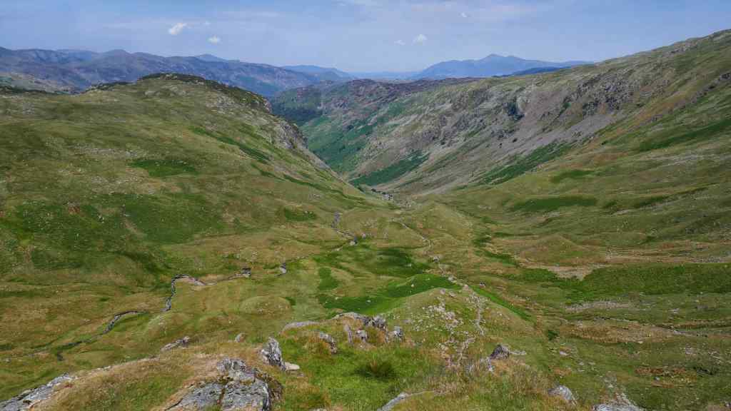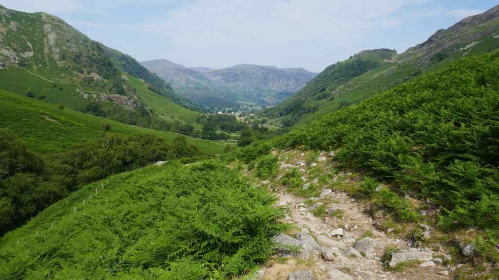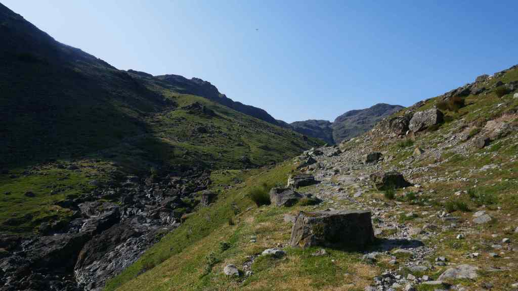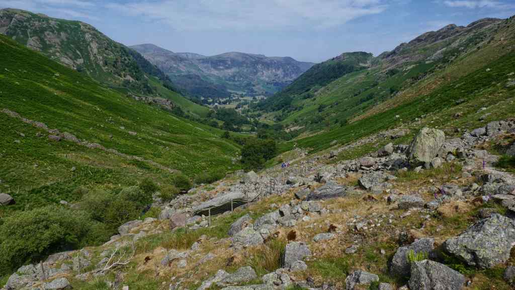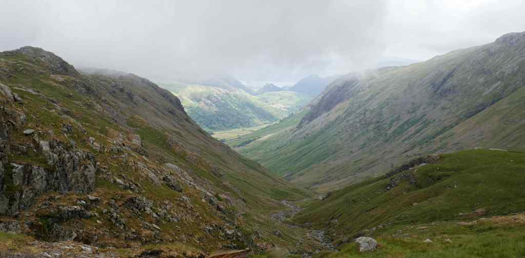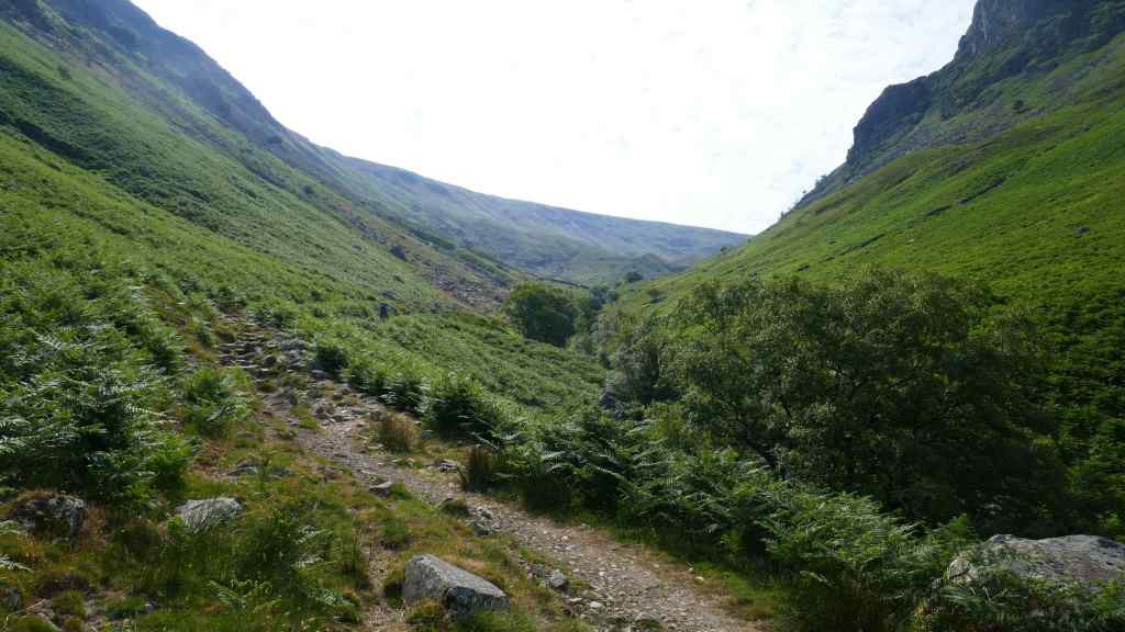 From here we planned to follow a path down into the Langstrath Valley. This disappeared so we descended on rough ground and eventually picked up the path we were looking for.
