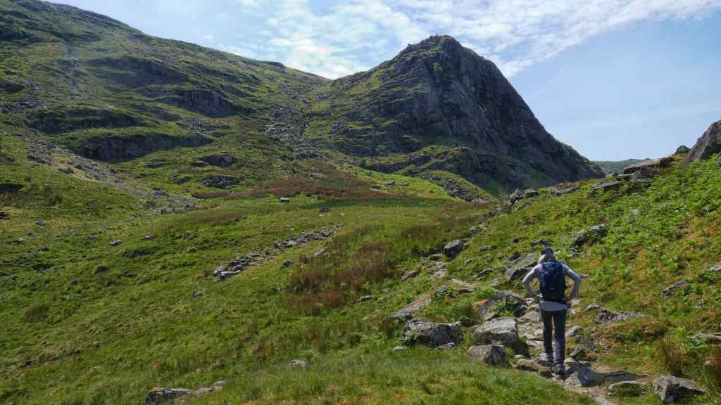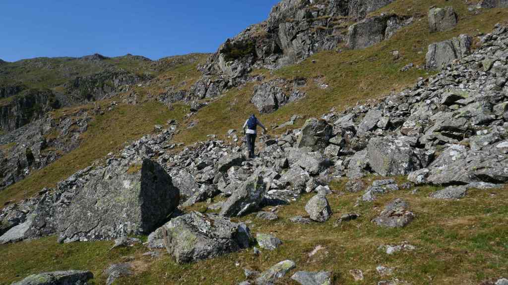 We started our second recce early, at 7.45am in order to escape the heat of the day whilst we climbed up to the summit of Glaramara. What we did not account for was the long walk in and the fact that it was to be the hottest day of our holiday with temperatures around 30 deg by mid morning. Once at the summit of Glaramara we should have followed an easy path to Sprinkling Tarn, then on to Styhead Tarn and returning to our start point in Seathwaite. By mid morning we had run out of water it was so hot, without reaching the first summit so we made the difficult decision to turn back.