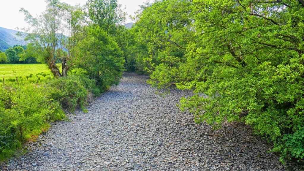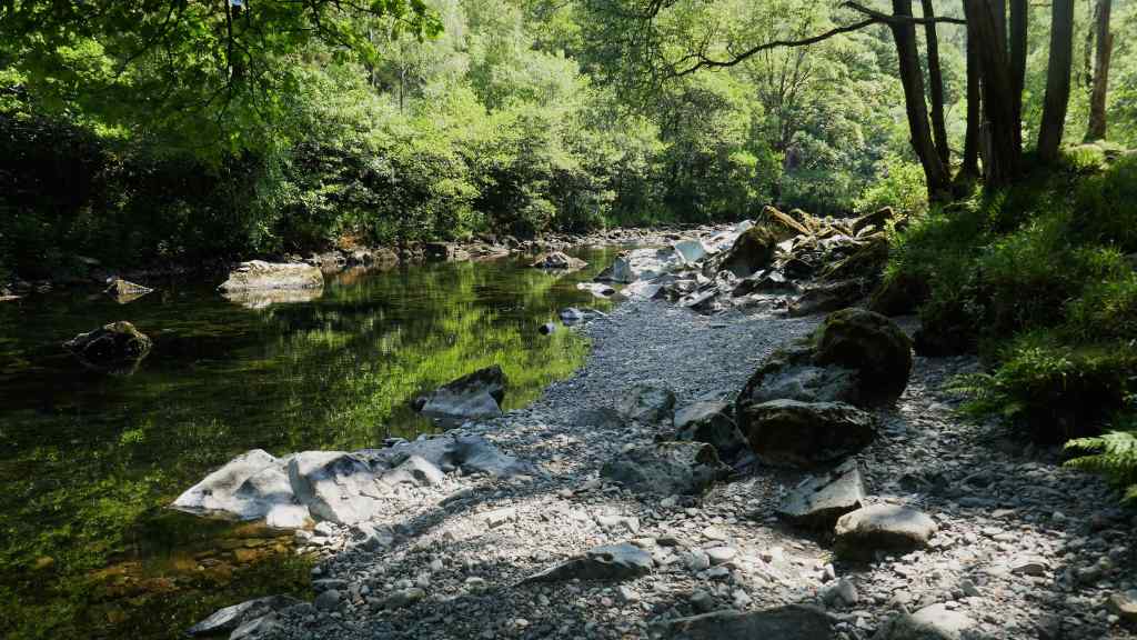 Top: Where is the river? The Derwent, which flows through Rosthwaite had dried up in the heat. 2 & 3: River Derwent further upstream, a little more water flowing. Bottom: Looking across Derwentwater in the shade of Manesty Woods