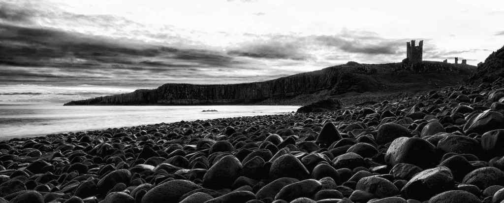 Top and 2: Dunstanborough Castle at sunrise; 3. The “beach” north of Dunstanborough Castle: 3. The pebble beach at Dunstanborough; 4. A mono conversion of the beach with Dunstanborough Castle in the background.