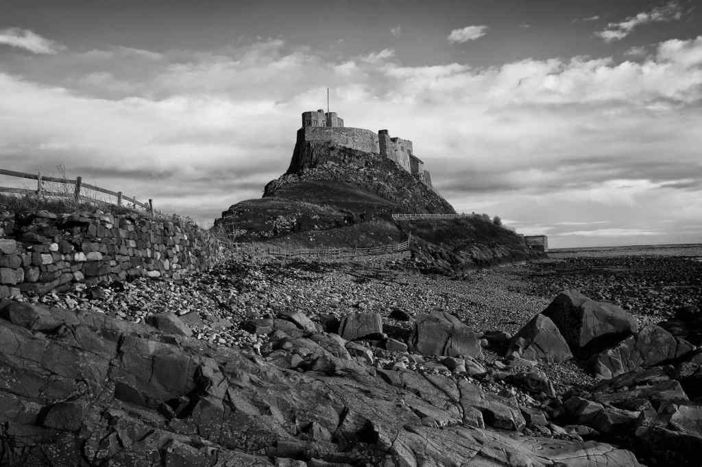 Top: Lindisfarne Castle from the “beach” below; Centre: Mono image for the castle from a similar perspective. Bottom: The castle from across the bay/harbour about 30 mins before sunset.