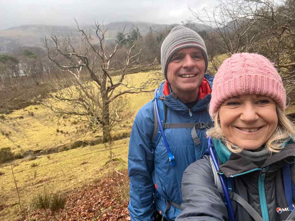 Top: The south end of Derwentwater gives some excellent views of Borrowdale. The fell in the centre is Castle Crag, which, although is dominated by the hills around is recognised as a “Must Do” for fell walkers. Bottom: We love a selfie! This one shot by Lyn on the return leg of our walk.