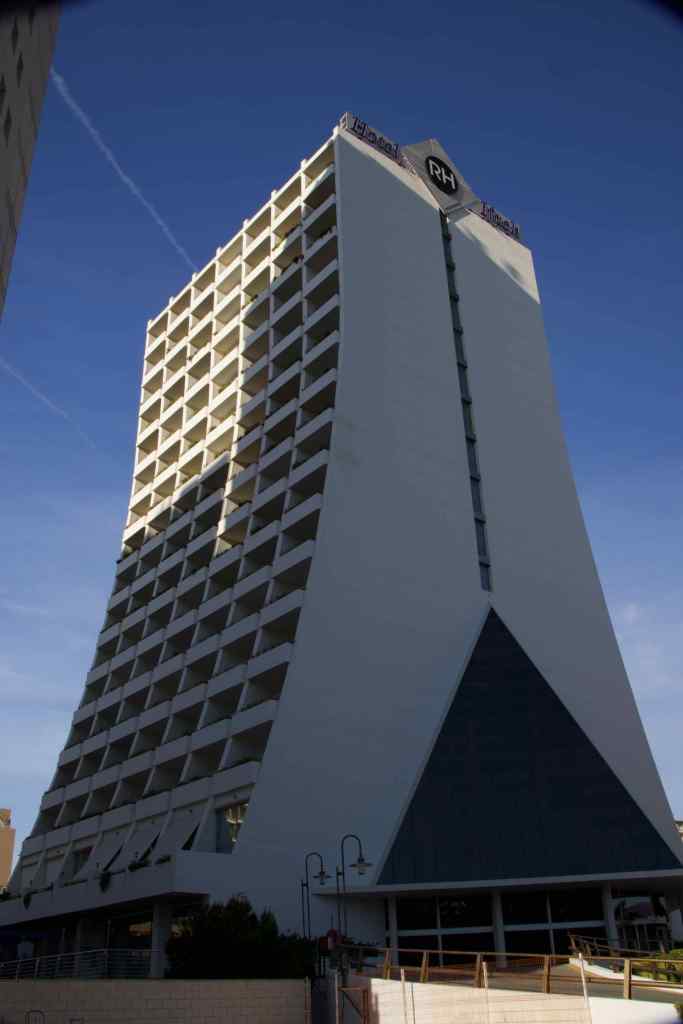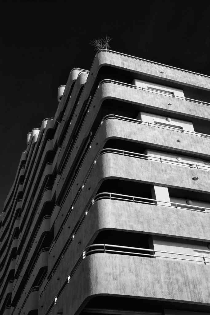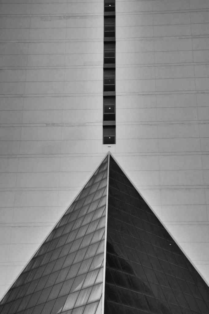 Our hotel is the top image. Keen eyed viewers will note that it tapers to the top. This means that those on the top couple of floors have great views, but the balconies are half the size of those in the rooms far below. The centre image is a mono conversion of the detail on the front of the hotel. The bottom image is the geometric girder work that supported the glass entrance to the reception.