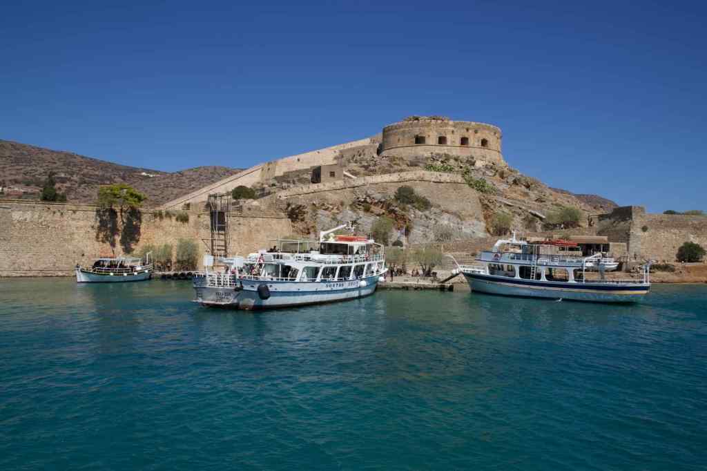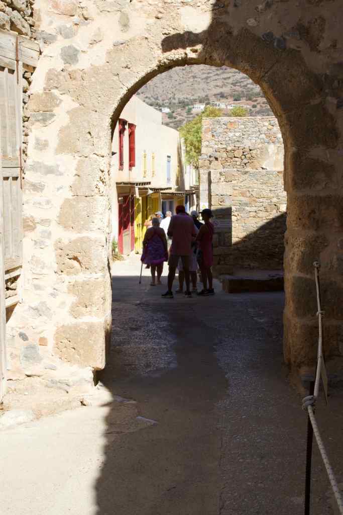 We were in Elounda to catch a boat to visit Spinalonga, a small island in the bay and the former site of a leper colony. The island was a leper colony from 1903 until 1957 although the last inhabitant, a priest, did not leave until 1962 in order to follow Greek Orthodox church tradition of observance of mourning the dead for a period of 5 years after passing. Previous to this, Spinalonga was for a long period, a defence fortification built by the Venetians in the 14th Century to defend Crete against the threat of invasion and pirate raids. Today the island is a tourist attraction, accessible only by boat. Much of its recent fame came through a novel by Victoria Hislop entitled The Island, published in 2005.