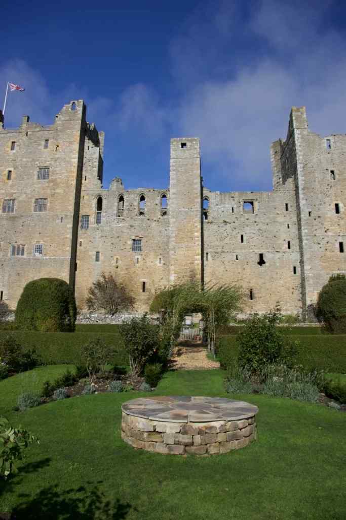 The back garden at Castle Bolton, with the sun shining.